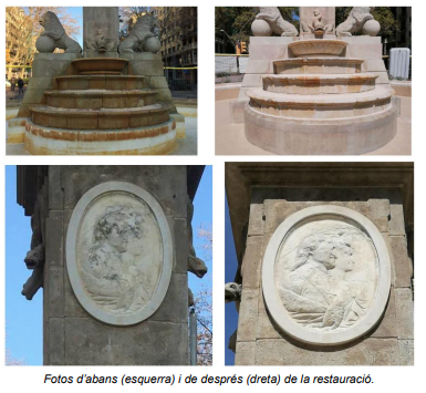 El monument està esculpit amb pedra de Montjuïc, un material molt porós que amb el temps ha anat absorbint residus de ferro provinents de l’aigua de la font. Per això tant l’escalinata com la boca dels lleons tenien una pàtina d’òxid que tenyia la pedra de color marró i embrutava l’aspecte original de l’escultura. També s’havia perdut el morter de junt dels elements que formen l’escalinata, on hi havien sortit taques verdes, i els medallons de marbre estaven força erosionats.