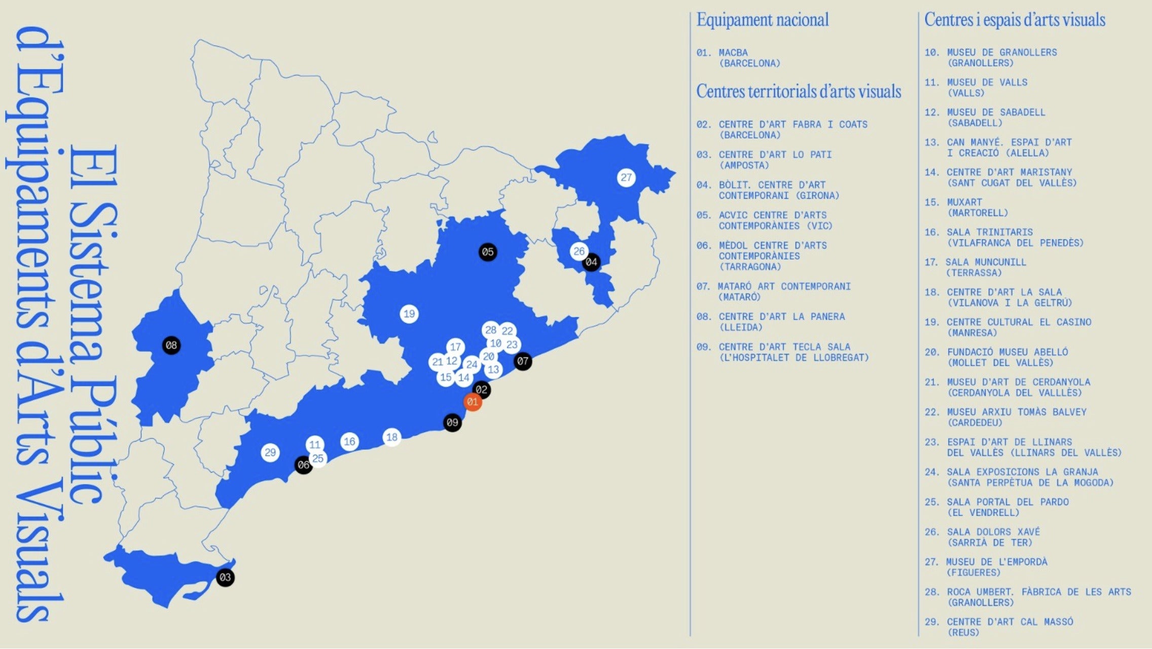 Tot sistema necessita un centre neuràlgic. En aquest cas és el MACBA, que actua com a equipament capçalera del SPEAV i que, des de Barcelona, dona cohesió a tot el mapa d’arts visuals del país. El museu barceloní aporta projecció internacional del sistema, recursos de recerca i documentació d’alt nivell, i una visió curatorial que orienta els equipaments territorials i locals. La capital catalana, doncs, exerceix un paper de lideratge, però amb una lògica de descentralització: posar el seu potencial al servei d’una xarxa que busca equilibrar l’oferta cultural a Catalunya.