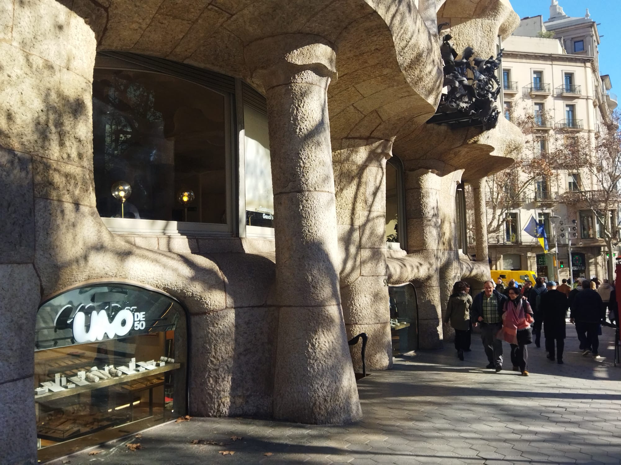 El desembre del 1907, l’Ajuntament va inspeccionar i va aturar les obres de La Pedrera. La intenció dels tècnics municipals era que Gaudí corregís la il·legalitat urbanística, però la resposta de l’arquitecte va ser que si l’obligaven a rectificar posaria una placa en la qual es recordaria que la columna s’havia retallat per ordre de l’Ajuntament, va explicar a finals de novembre, el periodista Xavi Casinos en un article a La Vanguardia.