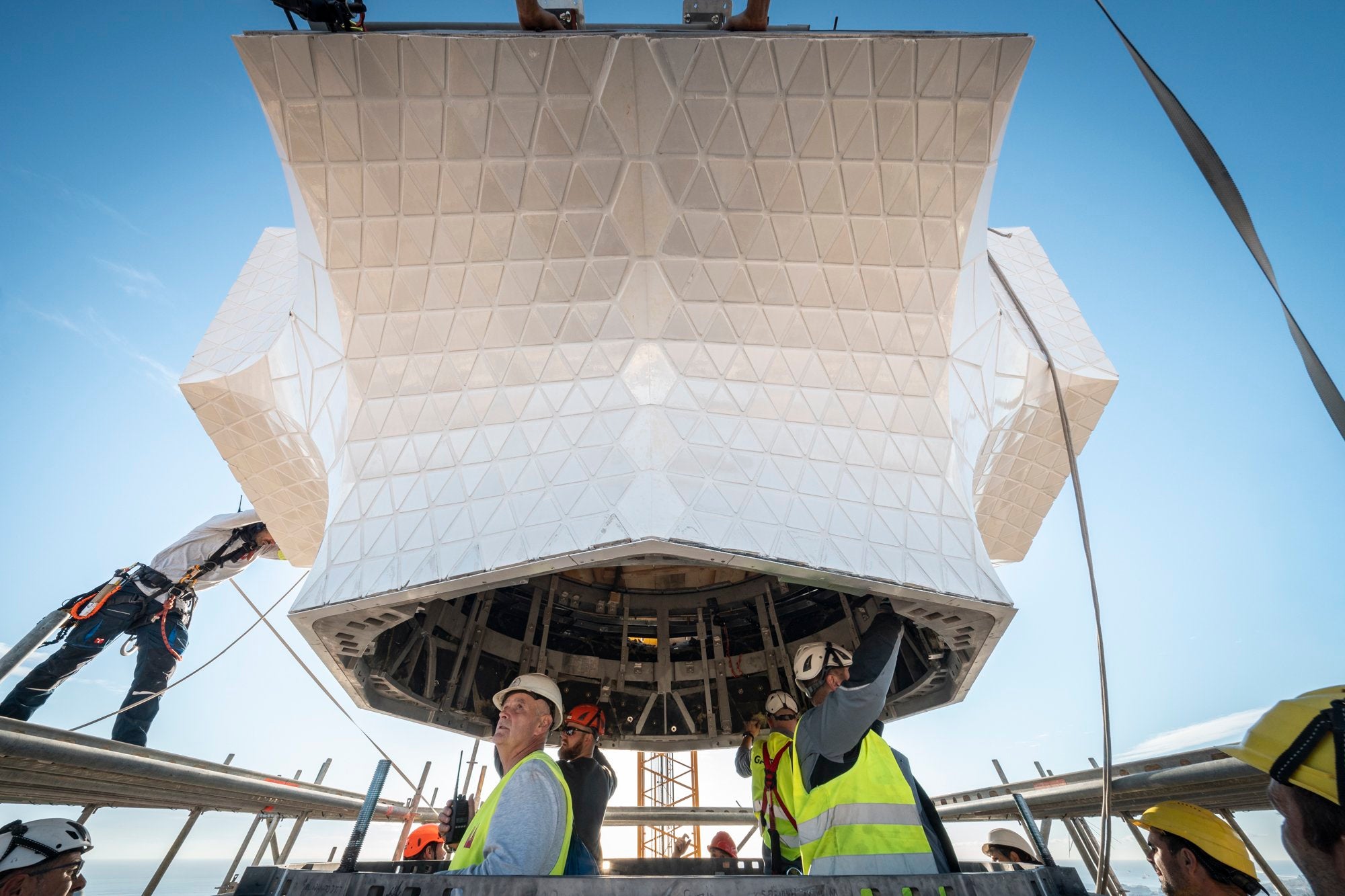 La Sagrada Família ha col·locat aquesta setmana la penúltima peça de la torre de Jesuscrist, que un cop acabada s’enfilarà fins als 172,5 metres d’altura i convertirà el temple de l’arquitecte reusenc Antoni Gaudí en la construcció més alta de la trama urbana de Barcelona. El segon element de la creu de la torre principal, de sis cares octogonals i 16,5 tones, connectarà els braços amb la creu. Seguint el més pur estil modernista de Gaudí, el nucli d’aquest tram final de la torre presenta superfícies de corbes amb triangles per aconseguir “transicions suaus amb els braços”, expliquen des del temple.