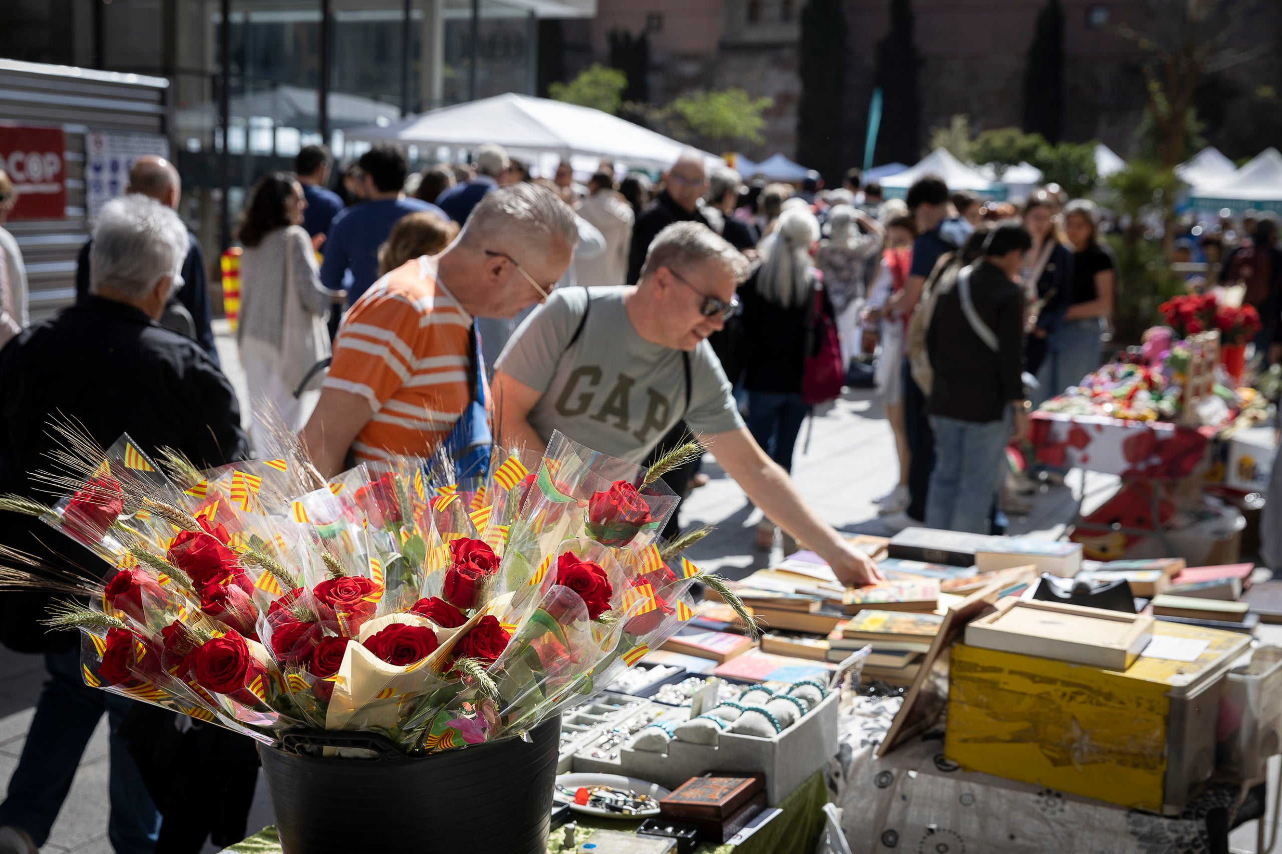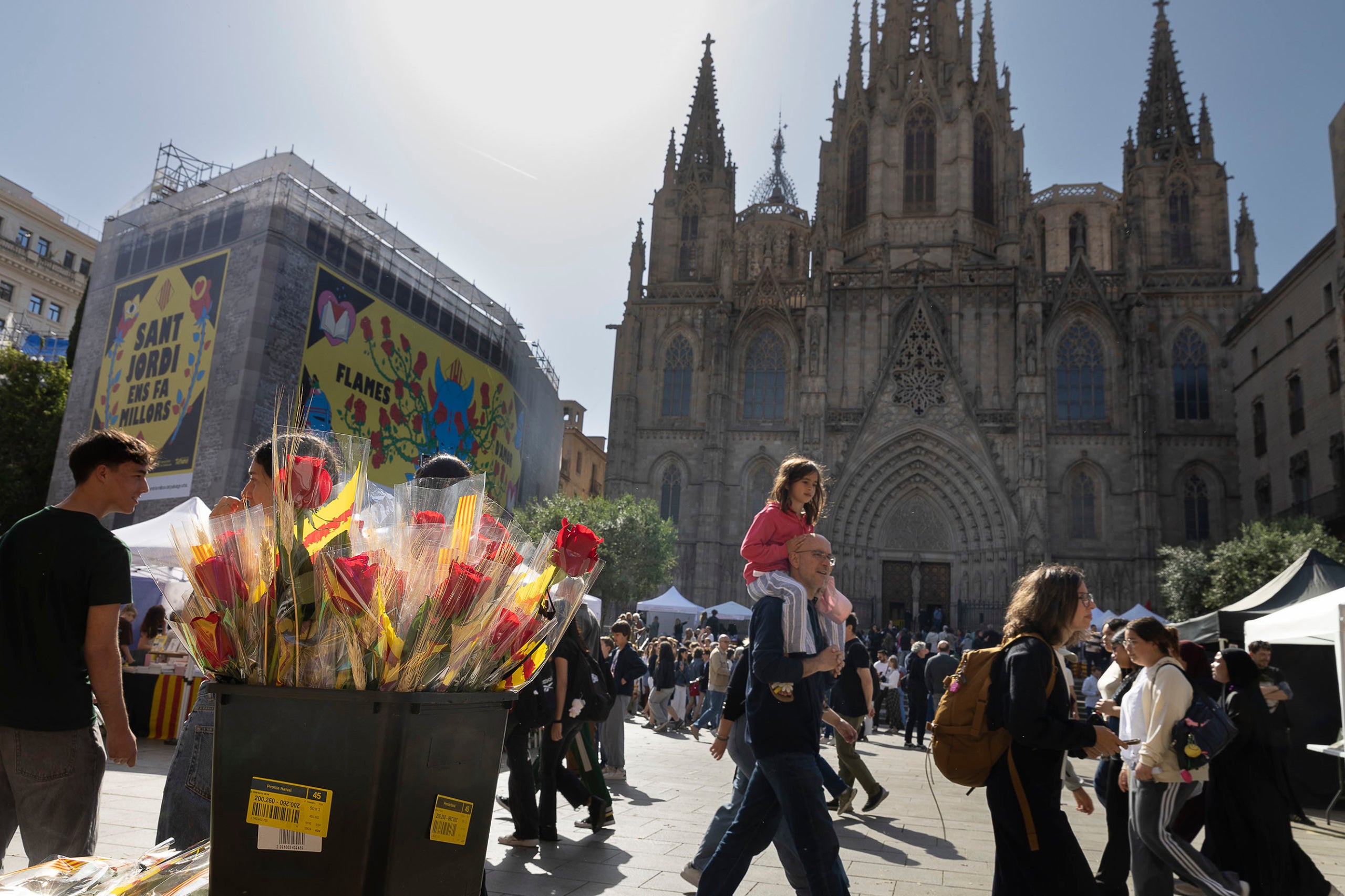 La mateixa imatge s’ha repetit en la majoria dels carrers del centre, plens de bat a bat. És el cas també de l’avinguda de la Catedral, que enguany debutava com a escenari de la diada a causa de les obres de remodelació que s’estan duent a terme a la Rambla. Allà s’han pogut veure parades d’alguns clàssics del passeig barceloní com la Llibreria Rodés (carrer dels Banys Nous, 8). Com han fet pràcticament des que el negoci va obrir fa més d’un segle, els darrers membres de la nissaga llibretera han muntat el seu tradicional estand, aquest cop lluny de la seva Rambla.