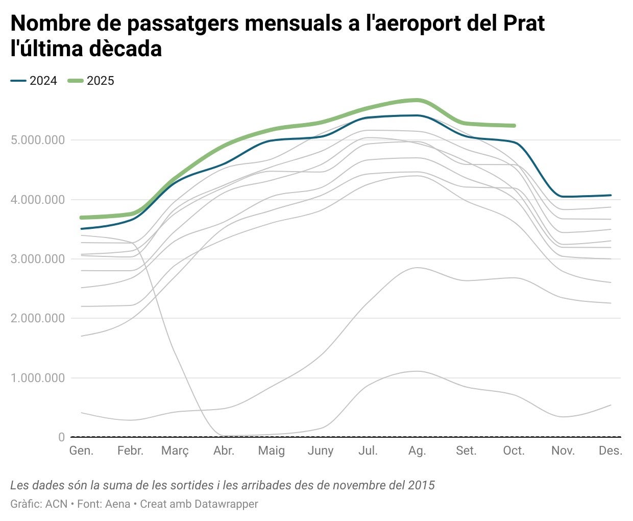 Del total de passatgers de l’any, 48,84 milions han viatjat en vols comercials, un 4,3% més que el 2024. D’aquests, els viatgers internacionals se situen en 36,85 milions (+5,9%), mentre que els domèstics n’han sumat gairebé 12 milions, un 0,4% menys que en les mateixes dates de l’any passat. Pel que fa al nombre d’operacions, el Prat ha registrat 32.802 vols a l’octubre (+4,1%), mentre que en el total anual ja n’acumula 306.253 (+3,8%). Tot i el seu creixement imparable, el Prat continua sent el segon aeroport de la xarxa d’Aena en nombre de viatgers, superat àmpliament pel de Madrid-Barajas, que aquest octubre ha registrat 6,03 milions de passatgers, un 6,3% més.
