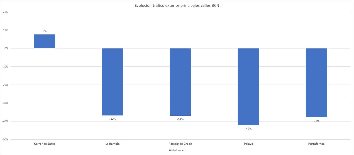 Quant als carrers comercials, l’informe apunta que el centre de la ciutat ha estat més castigat que els barris. De fet, l’eix comercial del carrer de Sants va incrementar un 8% l’afluència de persones durant el mes de gener malgrat la pandèmia. Altres punts com el carrer Pelai o el carrer de la Portaferrissa, en canvi, van reduir un 42% i un 38% el tràfic de vianants, respectivament. En la mateixa línia, la caiguda en el volum de persones al Passeig de Gràcia va ser del 37%, mentre que a la Rambla va ser del 32%.