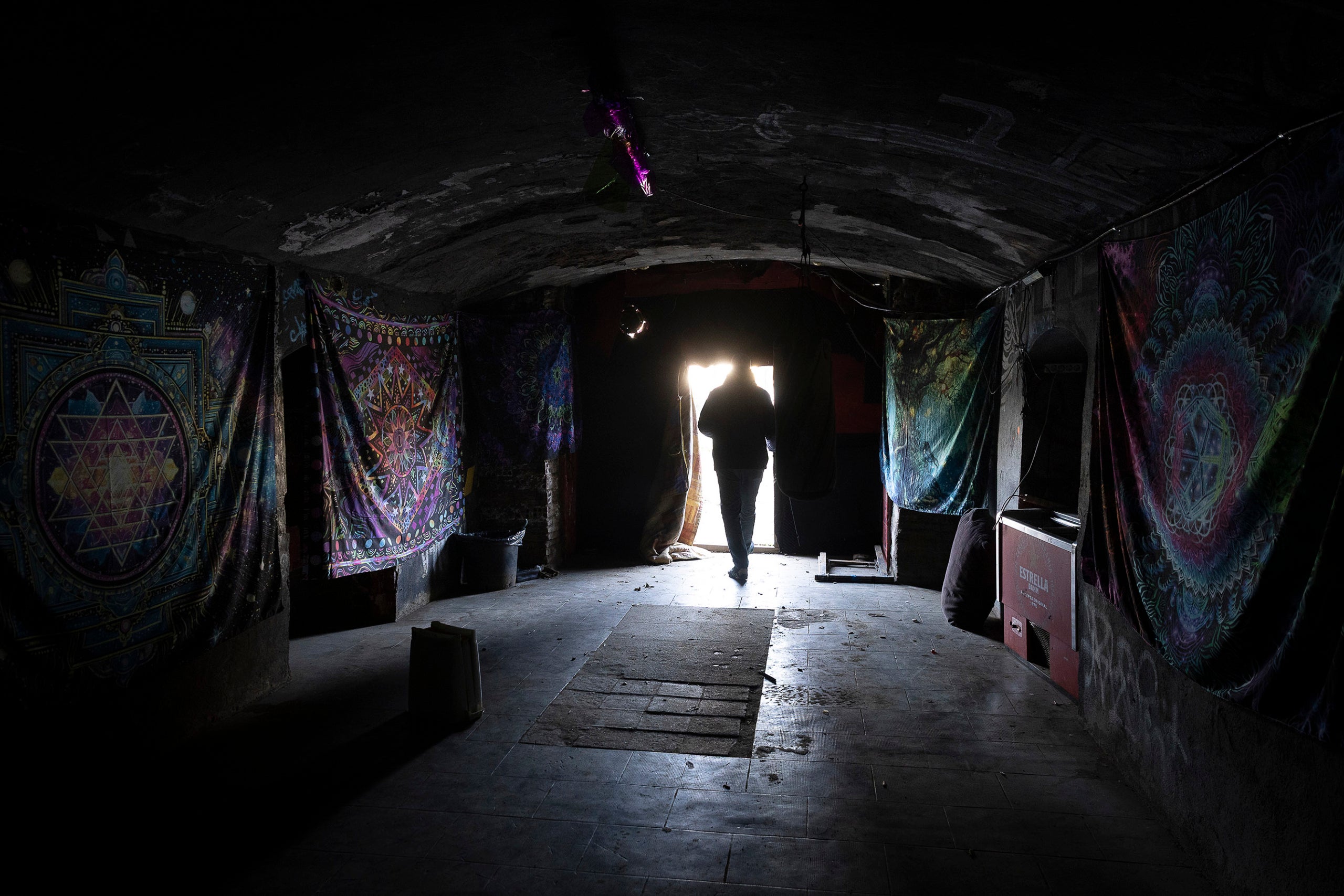 En este punto de los terrenos encontramos uno de los vestigios del pasado convulso de la Jungla. Varias aberturas en la pared se adentran en la roca para dar paso a una estancia diáfana, pero oscura con pareos colgados del techo. Aquí es donde antiguamente se celebraban los conciertos y las sesiones de música electrónica y ahora aún de vez en cuando se hace alguna actuación puntual.