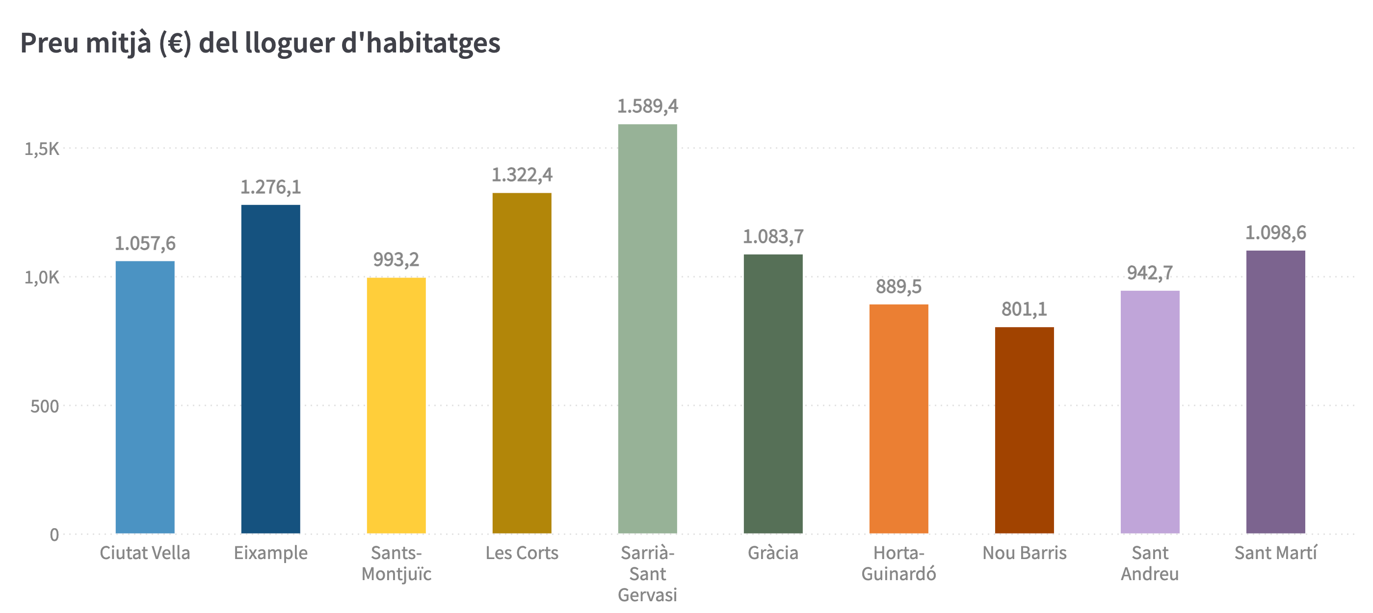 Pero si nos fijamos en los distritos, ¿cuál es el que concentra precios más caros y cuál el que tiene un parque de vivienda de alquiler más asequible? El rango de precios por distritos va de los 1.589 € (18,9 €/m2) que cuesta de media alquilar una vivienda en Sarrià-Sant Gervasi a los 801 € (13,1 €/m2 ) de media en Nou Barris, prácticamente la mitad. Les Corts (1.322 €) y l’Eixample (1.276 €) son el segundo y tercer distrito con los alquileres más caros. Otros distritos con medias de precios de alquiler por encima de mil euros son Sant Martí, Ciutat Vella y Gràcia. Podéis ver todos los precios en este gráfico: