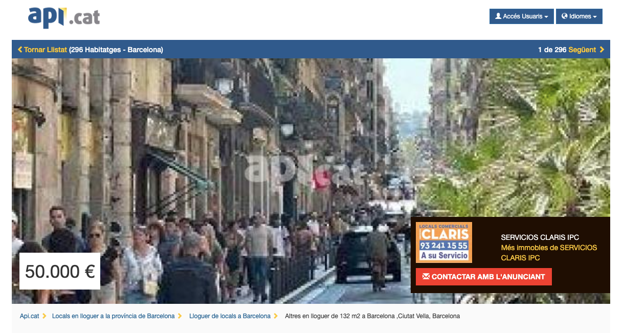 Igual que ocurre con el mercado residencial, el sector comercial también tiene anuncios con pretensiones económicas muy elevadas, como es el caso de un local de la calle Princesa, en el centro de Barcelona, por el cual piden 50.000 euros al mes. “Renta ajustada por debajo del precio actual de la zona”, asegura el anunciante, que ofrece un local de 132 metros cuadrados con zona comercial, almacén, oficina y lavabo. Esto da un precio de 379 euros por metro cuadrado, casi 24 veces por encima del precio medio de la ciudad, que es de 16 euros por metro cuadrado.