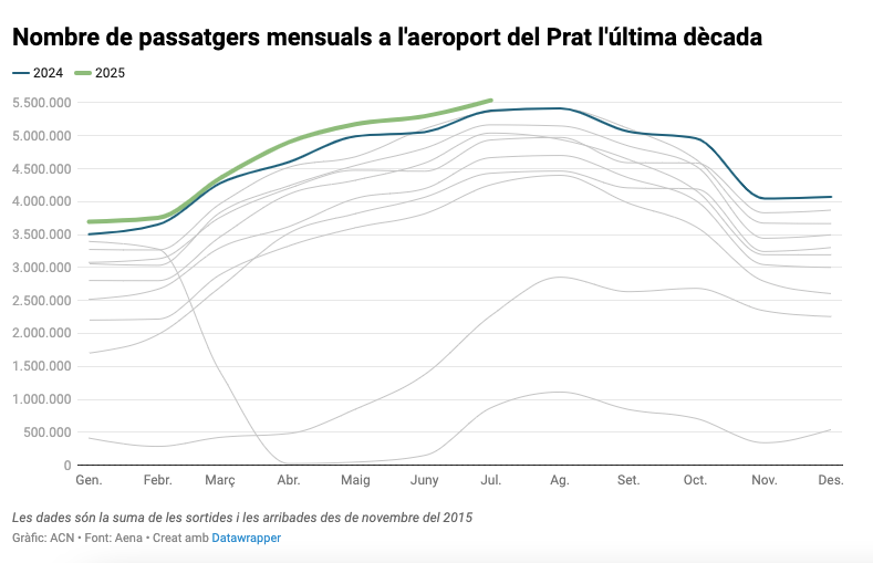 El aeropuerto de Barcelona-El Prat ha cerrado un nuevo mes con récord de pasajeros, tanto en términos mensuales como en el acumulado del año, y va camino de un año con cifras históricas. Durante el mes de julio han pasado por el Prat 5,54 millones de viajeros, un 2,9% más que en el mismo mes del año pasado, según ha informado Aena. En el total anual, el aeropuerto barcelonés suma 32,7 millones de pasajeros, un 4% más que en 2024. En pleno debate por el acuerdo entre la Generalitat y Aena sobre la ampliación del aeropuerto, el Prat ha gestionado 1,2 millones de pasajeros más que el año pasado. A este ritmo, la infraestructura terminará el año con más de 57 millones de viajeros, muy por encima de su límite teórico, que ronda los 55 millones.