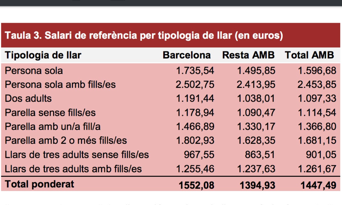 Cuántos dinero tenemos que tener para vivir con cierta comodidad en Barcelona? El estudio concluye que la media se sitúa en unos 1.552 euros. Una cifra que queda corta en tres de los ocho casos analizados. Una persona que reside sola necesita más 1.700€ para hacer frente a los gastos básicos; una pareja con 2 o más hijos, unos 1.800€; y todavía mucho más necesitan las familias monoparentales con hijos, unos 2.500€. En líneas generales, el salario de referencia aumenta un 8,2% respecto al 2021, una cifra muy superior a las otras variaciones interanuales, que apenas llegaban al 2% en el entorno metropolitano.