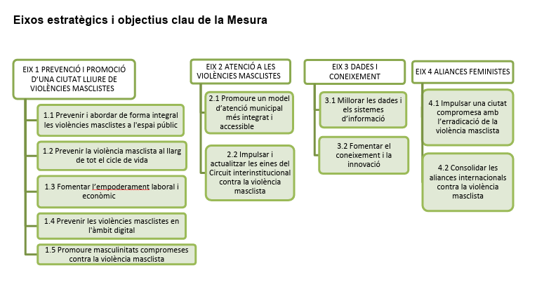 El consistorio barcelonés se ha propuesto como objetivo combatir estas violencias machistas a través de cuatro ejes fundamentales. En el primero, el de la prevención y promoción de una ciudad libre de violencias machistas, desde Sant Jaume buscan realizar acciones educativas, comunitarias y comunicativas para transformar los imaginarios sociales y promover relaciones igualitarias. En cuanto a la atención a las violencias machistas, el consistorio prevé un fortalecimiento de los servicios públicos para garantizar una respuesta integral, especializada y respetuosa con las mujeres y niños; un fortalecimiento que se puede ver reflejado en la ampliación del Servicio de Atención, Recuperación y Acogida (SARA).