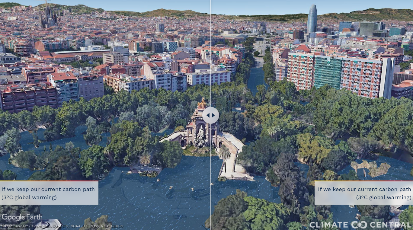Actualmente, según el último informe sobre las emisiones de CO₂, el calentamiento global ya ha aumentado 1,1 grados la temperatura mediana del mundo, y, si el volumen de emisiones continúa igual, en menos de 7 años podríamos llegar a aumentar 1,5 grados. Las previsiones de la aplicación sobre el cambio climático indican que el mundo no cambiaría especialmente con este aumento de la temperatura, pero sí que lo haría si el calentamiento global fundido dos veces más grande, es decir, 3 grados más de media en todas partes durante todo el año. Introduciendo estos datos en el buscador, la ciudad de Barcelona quedaría así: