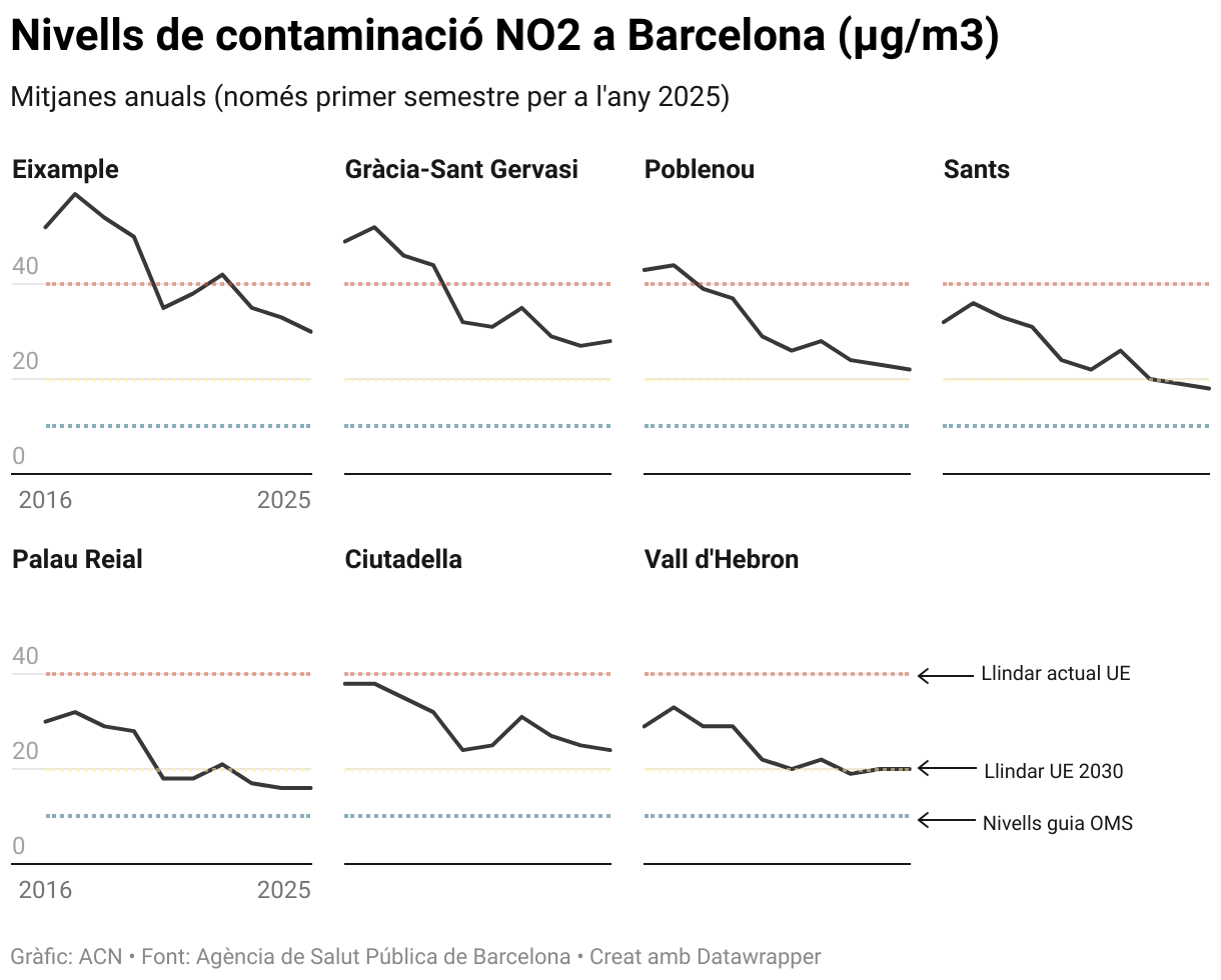 El Parlamento Europeo publicó en el año 2024 la nueva directiva de calidad del aire, que reduce de manera significativa los límites legales para la mayoría de los contaminantes atmosféricos a partir del año 2030 y los acerca a los valores que recomienda la Organización Mundial de la Salud (OMS). “Los niveles anuales de NO2 y PM2,5 en todas las estaciones de medición de la ciudad se mantienen por debajo de los valores límites legales actuales, pero por encima de los niveles guía de la OMS (10 y 5 μg/m³) y del valor legal europeo de 2030 (20 y 10 μg/m³)”, reconoce el consistorio. El informe de la Agencia de Salud Pública de Barcelona (ASPB) los nuevos umbrales fijados por Bruselas ayudarán a continuar reduciendo la contaminación del aire.