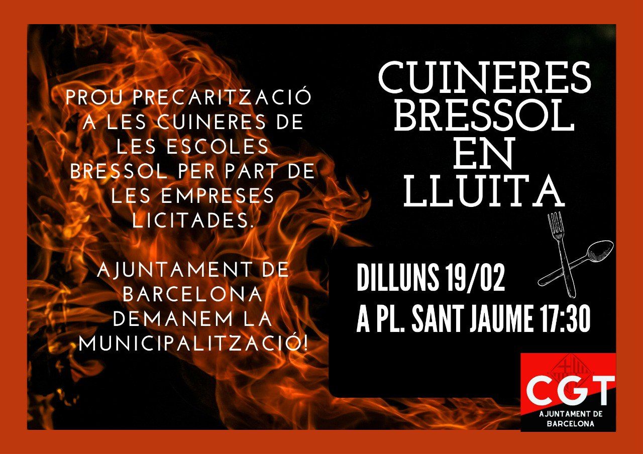 Además de la carta abierta dirigida a Collboni, desde la CGT han convocado una manifestación lo el próximo lunes, 19 de febrero, a las cinco y media de la tarde en la plaza de San Jaime, a las puertas del Ayuntamiento. Reclaman el pago puntual de las nóminas, el pago del plus de responsabilidad «por todas las cocinas», formaciones profesionales estipuladas dentro del horario laboral y remuneradas, tener la capacidad para decidir sobre su calendario laboral, puesto que denuncian que ahora mismo no tienen capacidad para escoger cuando hacen vacaciones, y tener una equipación de trabajo en condiciones.