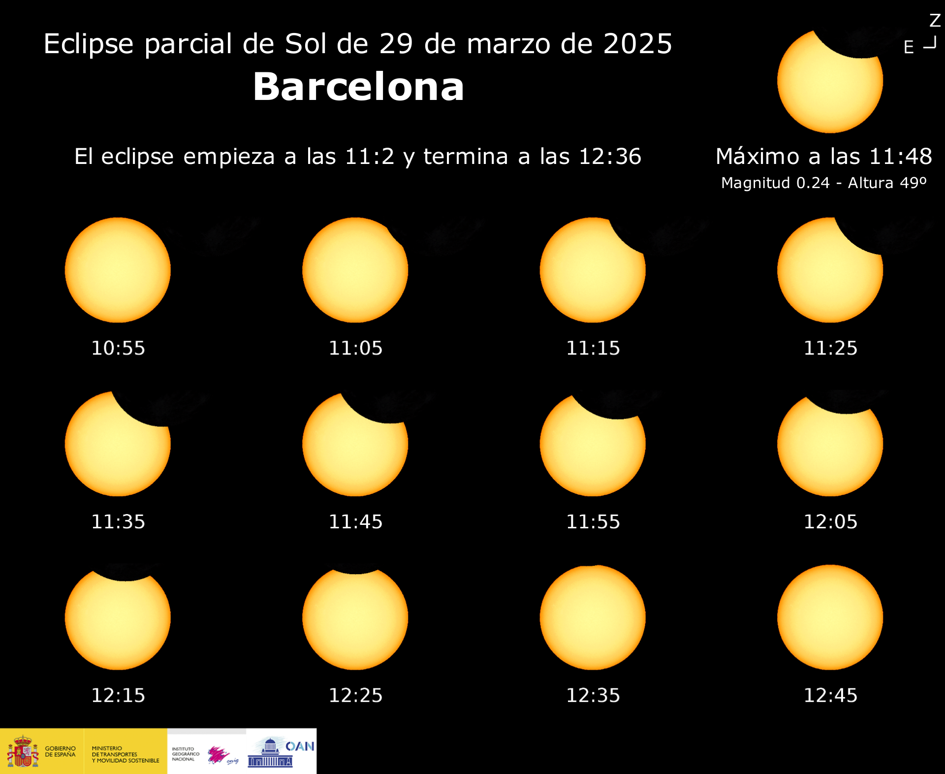 Este sábado por la mañana habrá un eclipse de sol parcial en Cataluña, un fenómeno que se produce cuando la Luna cubre el sol. El eclipse comenzará a las 11:02 horas en Barcelona y alcanzará su pico a las 11:48 horas, con una magnitud de 0,24, para concluir a las 12:36 horas, según el Observatorio Astronómico Nacional. El fenómeno podrá verse desde cualquier punto del Estado español, siempre que las condiciones meteorológicas sean óptimas para contemplarlo.