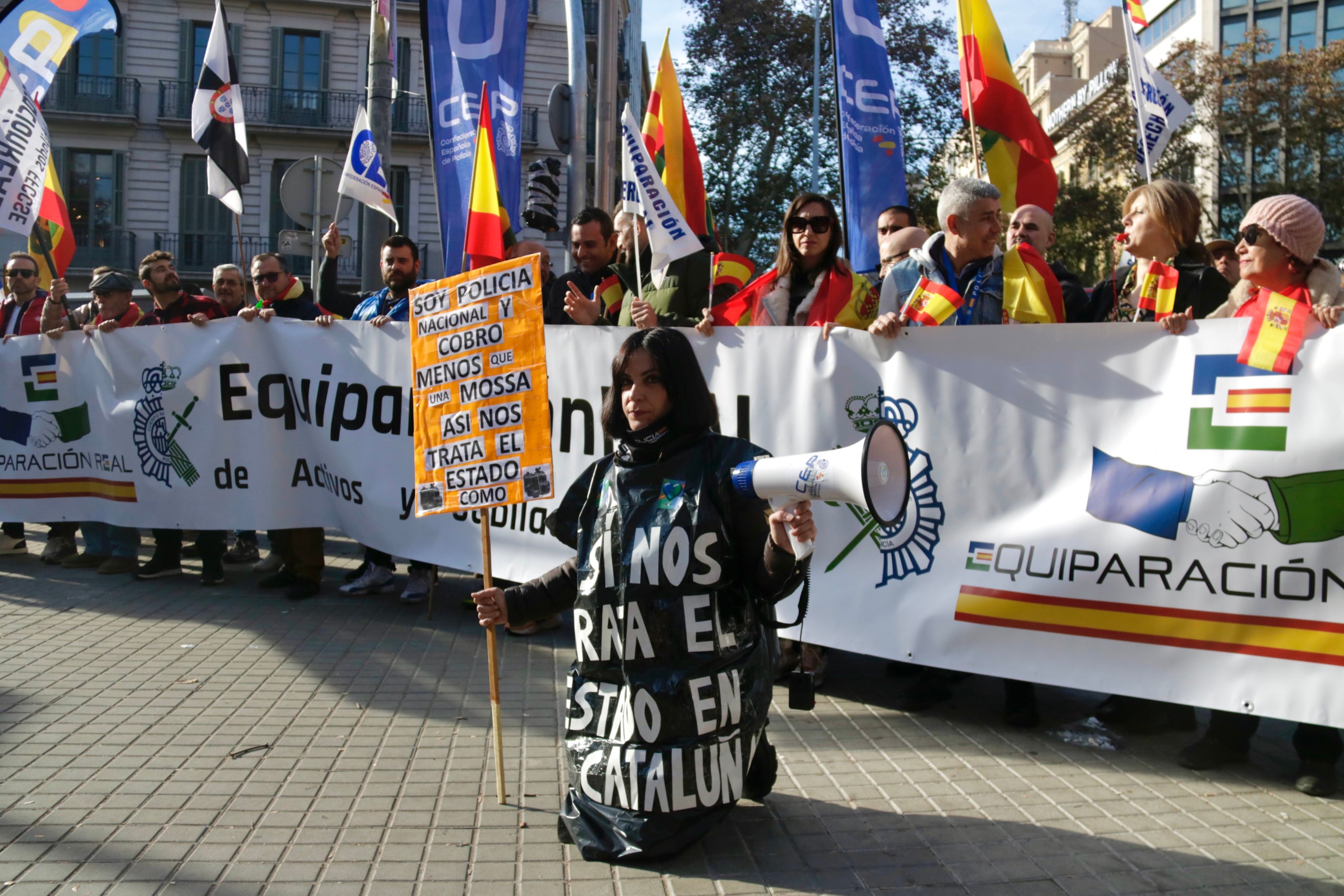 Cerca de un centenar de agentes de la Policía Nacional y la Guardia Civil venidos de todo el Estado han cortado este miércoles la vía Laietana de Barcelona para reclamar la equiparación salarial con el resto de cuerpos de seguridad locales y autonómicos, es decir, la Guardia Urbana de Barcelona y el cuerpo de Mossos d’Esquadra. El presidente del Movimiento Equiparación Real, Eliud Vega, ha asegurado que hay diferencias «abismales» en algunas partes que conforman los salarios de los policías, especialmente en términos de dietas, asistencia a juicios, servicios extraordinarios o la jubilación.