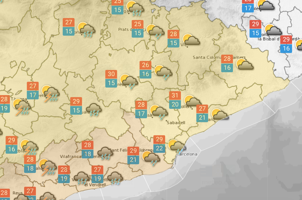 El Servicio Meteorológico de Cataluña (Meteocat) prevé la entrada de los primeros aguaceros del fin de semana por el oeste del país y una expansión hacia el interior a lo largo de todo el sábado. Según esta predicción, los chubascos afectarán el sector central del litoral y prelitoral y en la Cataluña central. Los primeros aguaceros, que se prevén de una intensidad «moderada» –el riesgo más alto lo encontramos hacia Tarragona– y acompañados de algunas tronadas, aparecerán este sábado por la mañana y se alargarán durante la semana, si bien con pausas largas intermedias. Barcelona se escapa de los grados más altos de peligro, pero no de la lluvia, que caerá con cierta intensidad durante las primeras horas del fin de semana y volverán con fuerza el lunes.