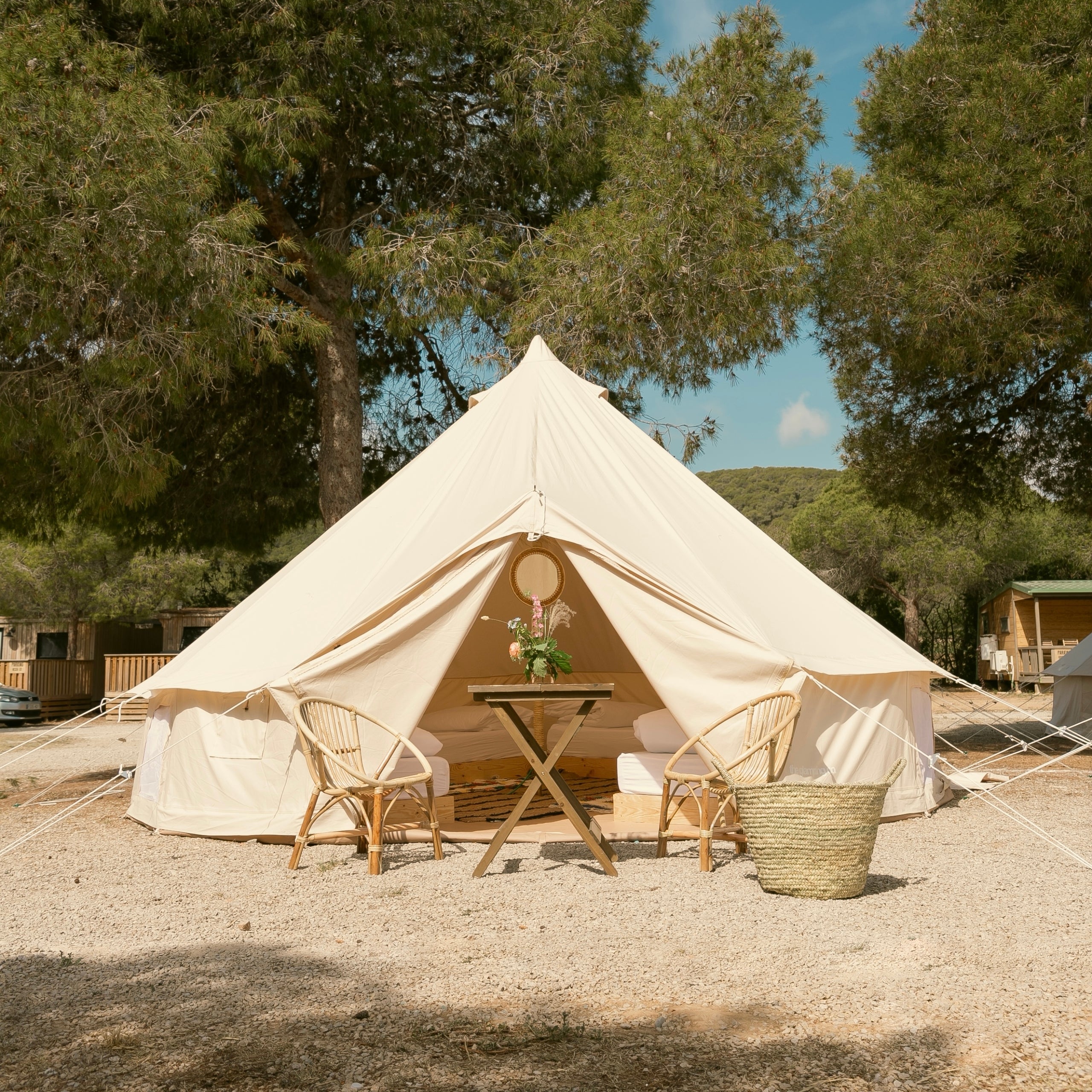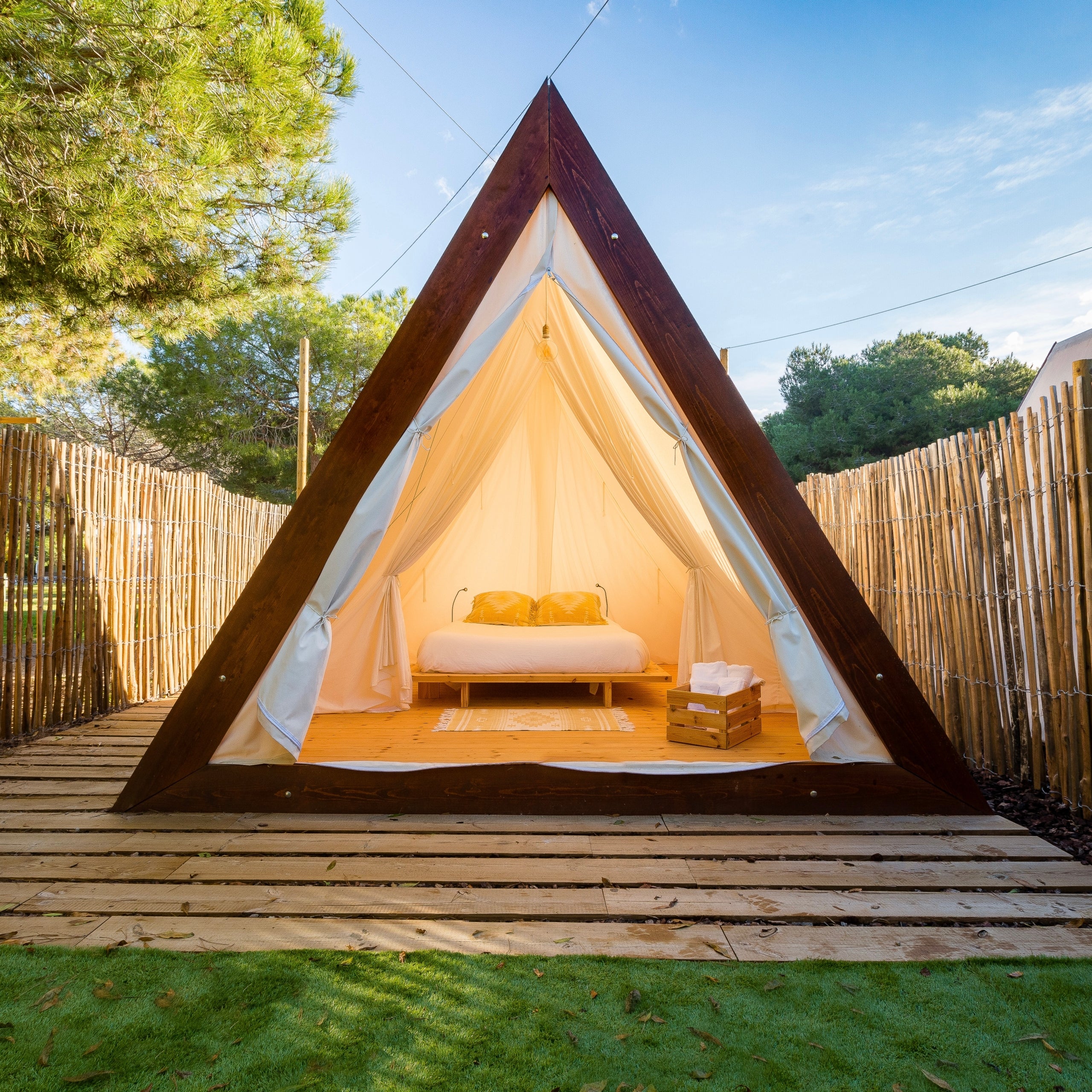 Glamur en plena natura. Máximas comodidades -más que en muchos hoteles-, relajamiento, aire puro, el pío-pío de los pájaros de música de fondo. Pero también aventura, gastronomía, ocio para grandes y pequeños y deporte. El concepto de camping ha vivido una revolución total en los últimos años y a estas alturas se ha consolidado como una opción que tiene más a ver con un estilo de vida, de goce del entorno y de socialización que no con aquella idea de que ir de camping era la única opción que tenían las familias con menos posibilidades económicas. Naturalmente, las tiendas de campaña plegables y las caravanas con su toldo, la mesa y las sillas tienen todavía larga vida, pero ¿quién se imagina que en un camping nos podamos sentir como en un safari africano, estar tumbados en una cama dentro de un glampin con forma geodésica contemplando en silencio una noche estrellada, o leyendo un libro en la terraza de un loft de madera? Esto es el que ofrece el Garrofer Green Camping de Sitges, gestionado por HolaCamp, un espacio nacido en los años sesenta y que ha sido galardonado por la Federación Española de Campings como el camping más original, por su «enfoque hacia nuevos tipos de alojamientos innovadores y sostenibles diseñados para disfrutar de experiencias únicas».