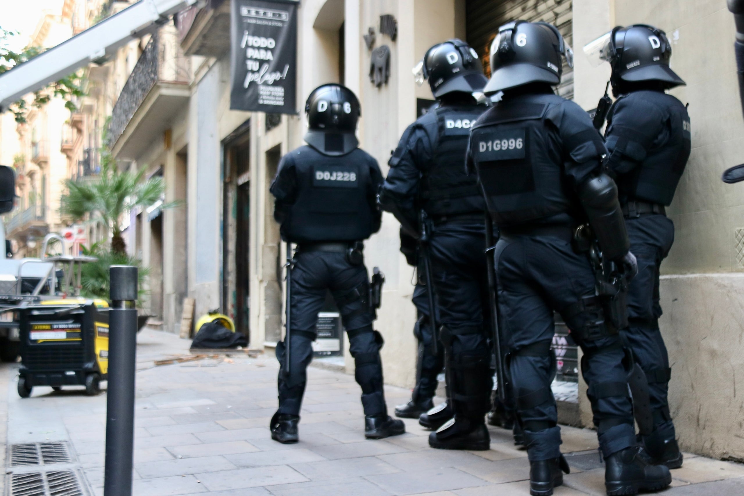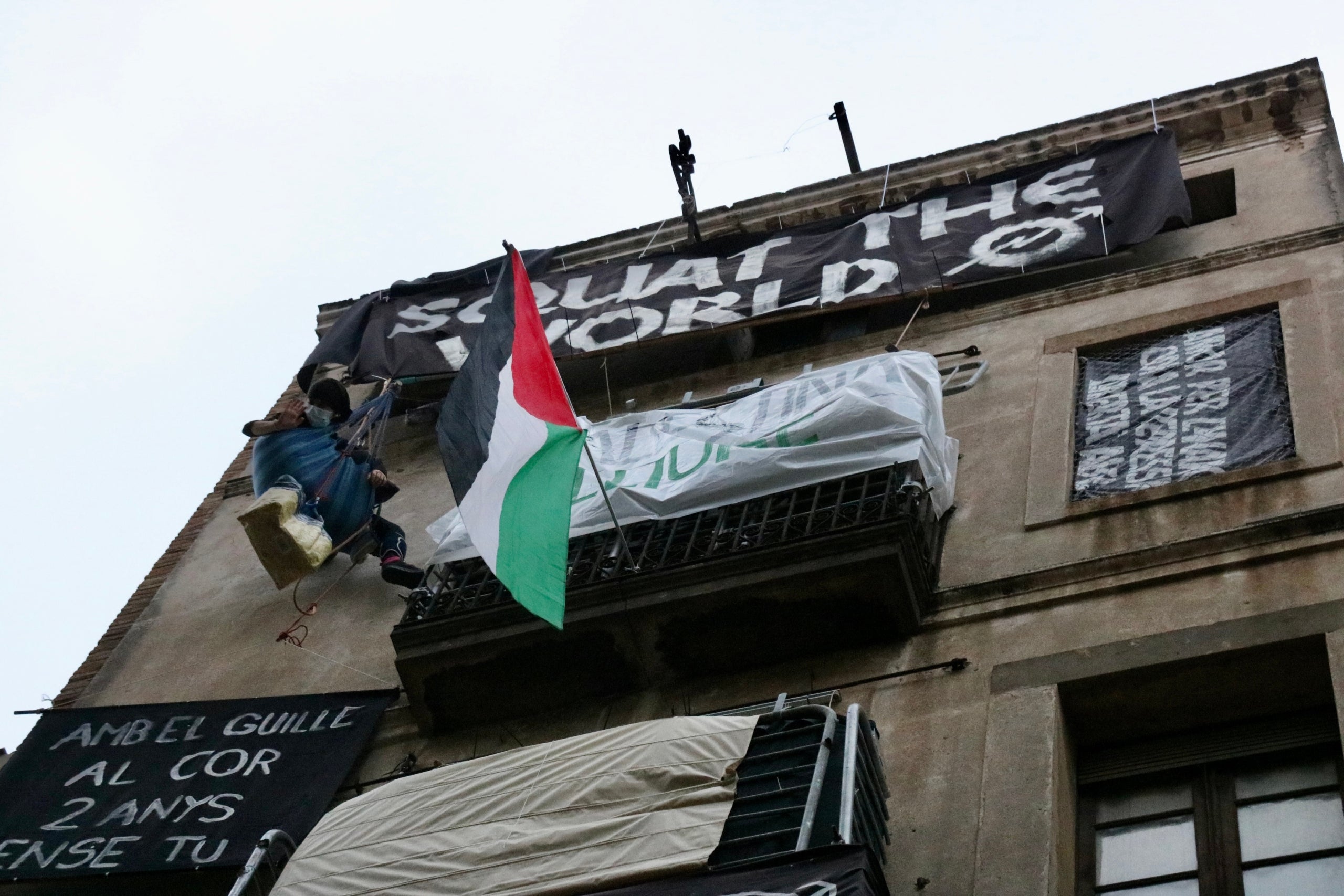 Varios encapuchados con la cara tapada comenzaron a mover contenedores mientras huían. Algunos intentaron esconderse en una frutería, pero los Mossos los atraparon y los obligaron a salir. A continuación, volvieron a colocar los contenedores en su sitio y retrocedieron con las furgonetas para establecer un perímetro de seguridad alrededor de Ca l’espina. El edificio, que tiene cuatro plantas y lleva cinco años ocupado, lucía varias pancartas a favor de la ocupación como “la Gràcia aburguesada continuará siendo ocupada” y una bandera Palestina.