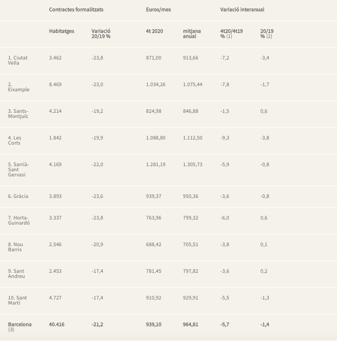 Per altra banda, el nombre de contractes de lloguer a la capital catalana ha caigut un 21,2% el 2020, amb 40.416 habitatges llogats. Els districtes de Ciutat Vella i Horta-Guinardó han estat els més afectats pel descens de contractes signats, amb una caiguda del 23,8% en el quart trimestre en els dos casos. Sant Andreu i Sant Martí han registrat les caigudes més moderades, del 17,4%.