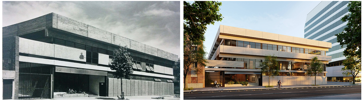 Va ser construït el 1963 pel despatx que compartien els arquitectes Guillermo Giráldez, Pedro López Íñigo i Xavier Subias, autors d’altres projectes racionalistes de Barcelona com el primer pla de Montbau o la Facultat de Dret de la Diagonal. Va ser ampliat dos cops, el 1970 i el 1986. Ara l’ha reinventat l’arquitecta Inés Rodríguez, d’acord amb un pla especial per aquest edifici aprovat al ple municipal el 2017.