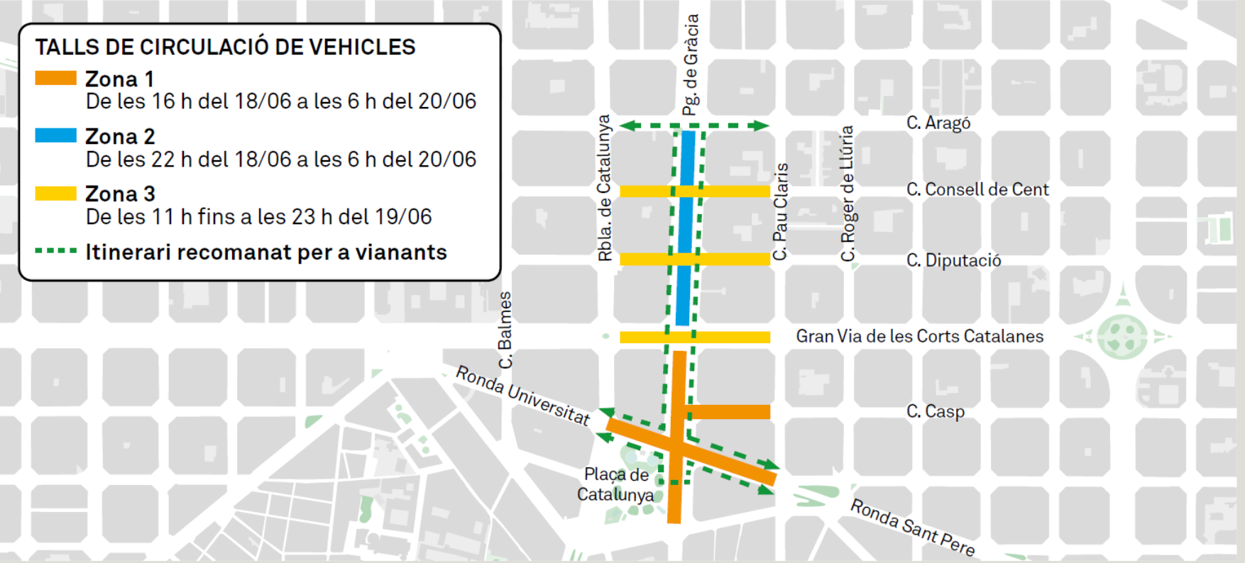 - Passeig de Gràcia, entre la Gran Via i el carrer Aragó, sense afectar les transversals.