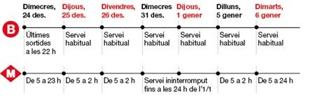 Així mateix, i com és habitual, la nit de Cap d’Any, que va del 31 de desembre a l’1 de gener (Any Nou), el metro donarà servei de manera ininterrompuda fins a la mitjanit del dijous 1 de gener. Pel que fa al dilluns 5 de gener, nit de Reis i vigília de festiu, el metro funcionarà fins a les 2 de la matinada, mentre que el dimarts 6 de gener, dia de Reis, els últims combois de metro sortiran a la mitjanit. Les línies del Barcelona Bus Turístic no prestaran servei les festivitats de Nadal i Any Nou.