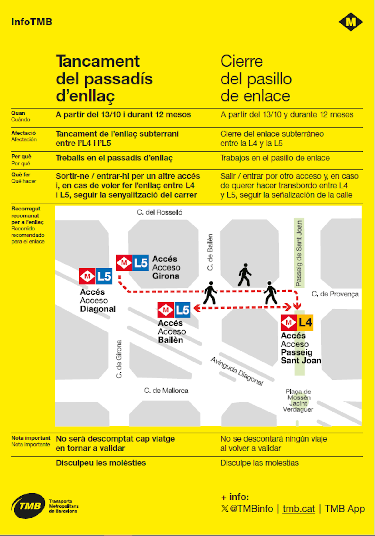 Un intercanviador important de la xarxa de metro tancarà un any per obres a partir del dilluns, 13 d’octubre. Es tracta del passadís de l’estació de Verdaguer, que uneix les línies L4 i L5. La data ha estat confirmada per Transports Metropolitans de Barcelona (TMB). Inicialment, la clausura estava prevista per aquest setembre, tal com va avançar el TOT Barcelona el passat dia 22, però s’ha endarrerit unes setmanes.