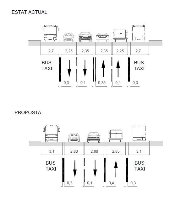 Aquest tram central de sis carrils té una amplada que oscil·la entre els 15,5 i els 16 metres. “Aquesta distribució genera que l’amplada del carril bus acabi essent massa estreta pel pas d’aquest vehicle, especialment en moments de trànsit intens”, explica el consistori. A partir d’ara, els conductors que vagin en direcció a Roger de Llúria només podran circular per un sol carril –l’altre serà per l’autobús–, mentre que en sentit contrari es mantindran el 2+1 actual.