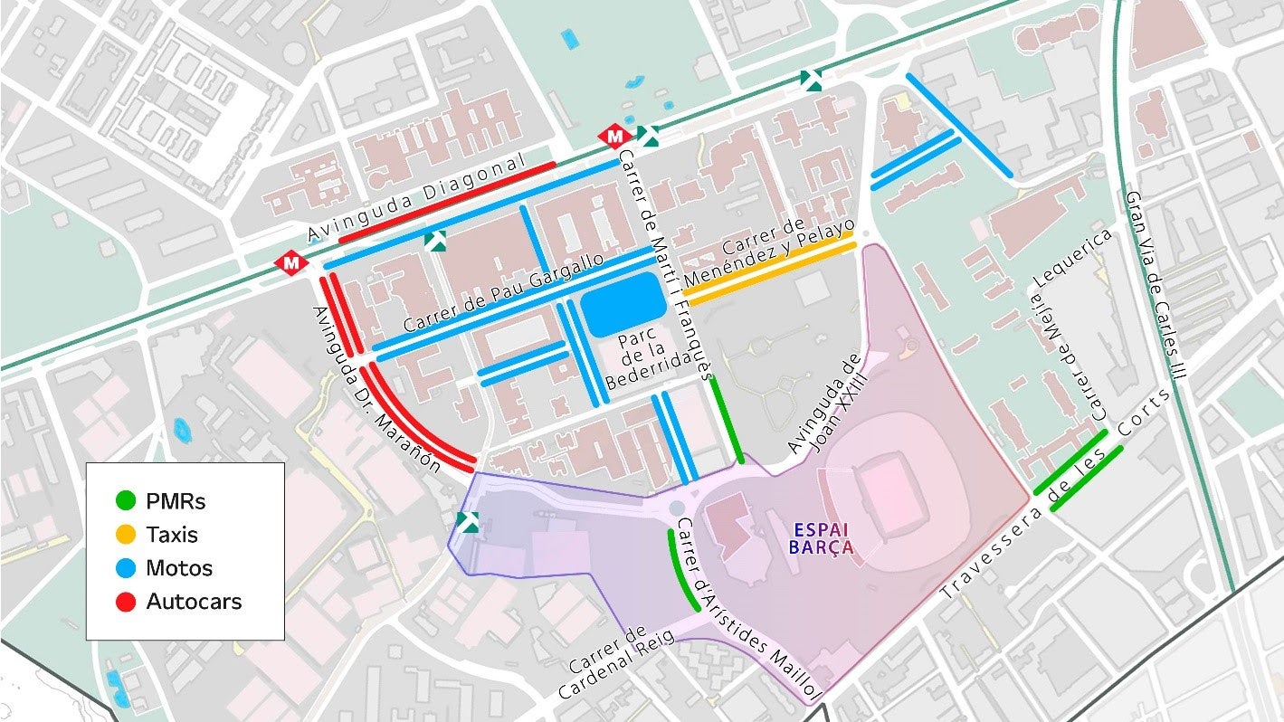 D’altra banda, els tiquets de l’entrada pel partit –que han despertat crítiques pels preus elevats; necessaris, segons el club, per compensar les pèrdues dels dos partits jugats al minúscul Johan Cruyff– informaran de les diferents zones d’aparcament disponibles ara mateix. En un radi de distància d’un quilòmetre i mig hi ha capacitat per a 9.500 cotxes, i el club preveu construir un pàrquing subterrani a l’Espai Barça. L’Ajuntament també habilitarà un total de 2.000 places de motos –entre les ja existents i les noves– al voltant de l’estadi, cedint a la causa un solar públic que hi ha al parc de la Bederrida amb capacitat per a 600 motos. Fins ara hi havia una carpa d’usos esportius en aquest emplaçament i l’executiu, que defensa que és una cessió “provisional”, encara no ha decidit que hi farà pròximament.