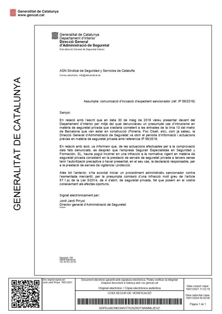 Després de gairebé tres anys, Interior ha informat el sindicat, mitjançant un document del 19 de gener, de l’inici d’un procediment sancionador després de comprovar que l’empresa pirata “hauria pogut incórrer en una infracció a la normativa vigent en matèria de seguretat privada” ja que no tenia “l’autorització preceptiva” o, en el seu cas, “la declaració responsable”.
