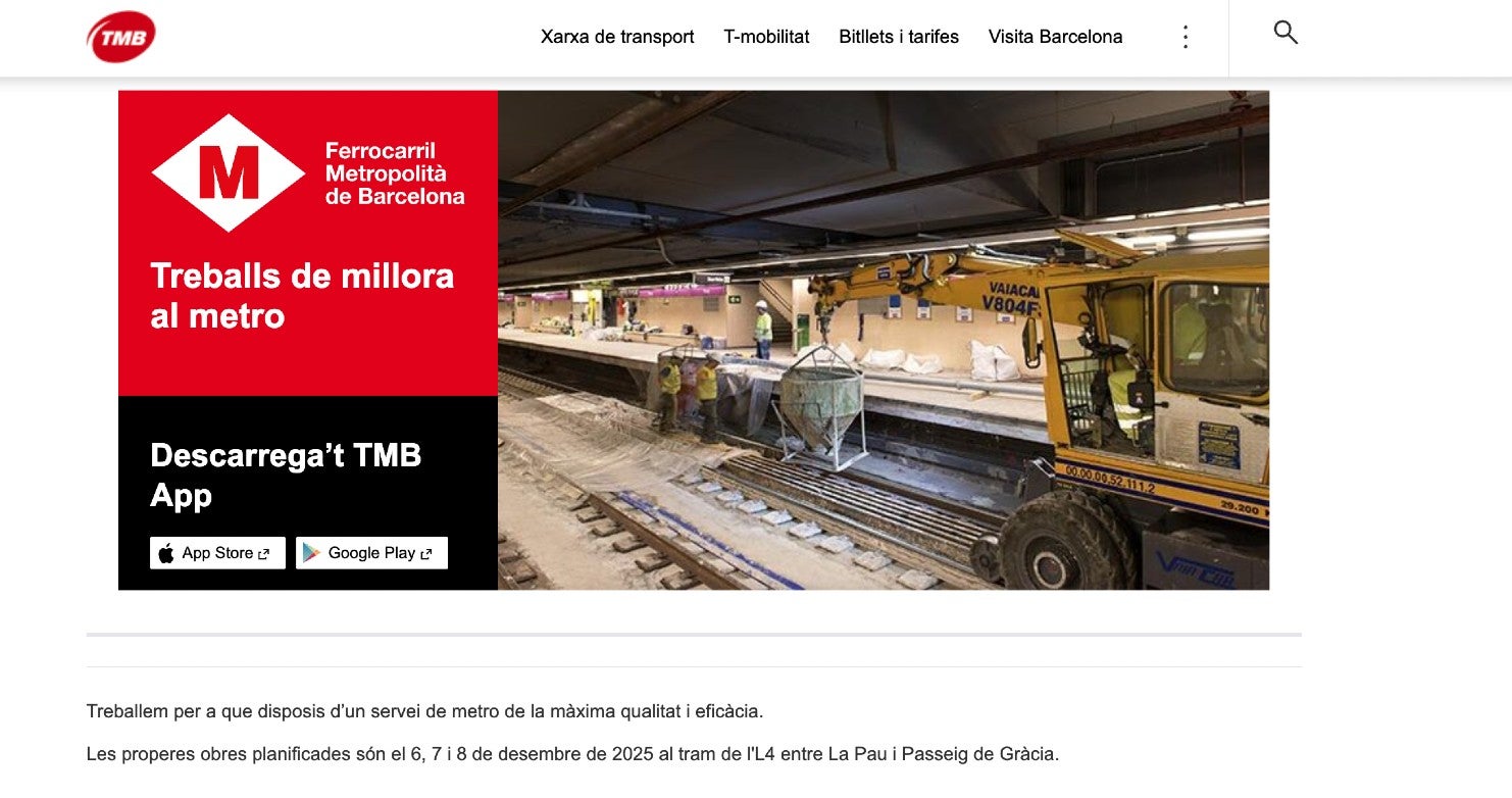 Abans que acabi el 2025, TMB tornarà a tallar l’L4 per executar més obres, en aquest cas de renovació de la senyalització. Serà durant el pont de desembre, entre els dies 6 i 8. L’aturada del servei afectarà el tram entre les estacions de la Pau i passeig de Gràcia, en total 13 estacions. L’L4 funcionarà aquells dies entre Trinitat Nova i passeig de Gràcia. El dia 8 de desembre en concret, entre les 05.00 i 08.00 del matí, el tall es perllongarà a dues estacions més, Girona i Verdaguer [veure aquí]. També durant el pont de desembre, les obres d’accessibilitat a la parada del Clot deixaran inoperativa l’andana de l’L2 en direcció a Badalona-Pompeu Fabra.