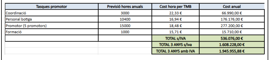 Segons consta a la licitació consultada pel TOT Barcelona, el cost íntegre del contracte és per costejar el personal de la botiga. El concurs reserva 3.000 hores anuals per a la categoria de coordinació, que s’hauran de repartir almenys dues persones, amb un cost de 66.990 euros; 10.400 hores per al personal de la botiga pròpiament dit, que equival a 5,6 jornades completes, amb un preu de 176.176 euros anuals; 15.000 hores per als promotors amb un cost de 277.200 euros; i es preveuen unes 1.000 hores de formació per 15.719 euros. En total, 536.076 euros l’any, IVA exclòs.