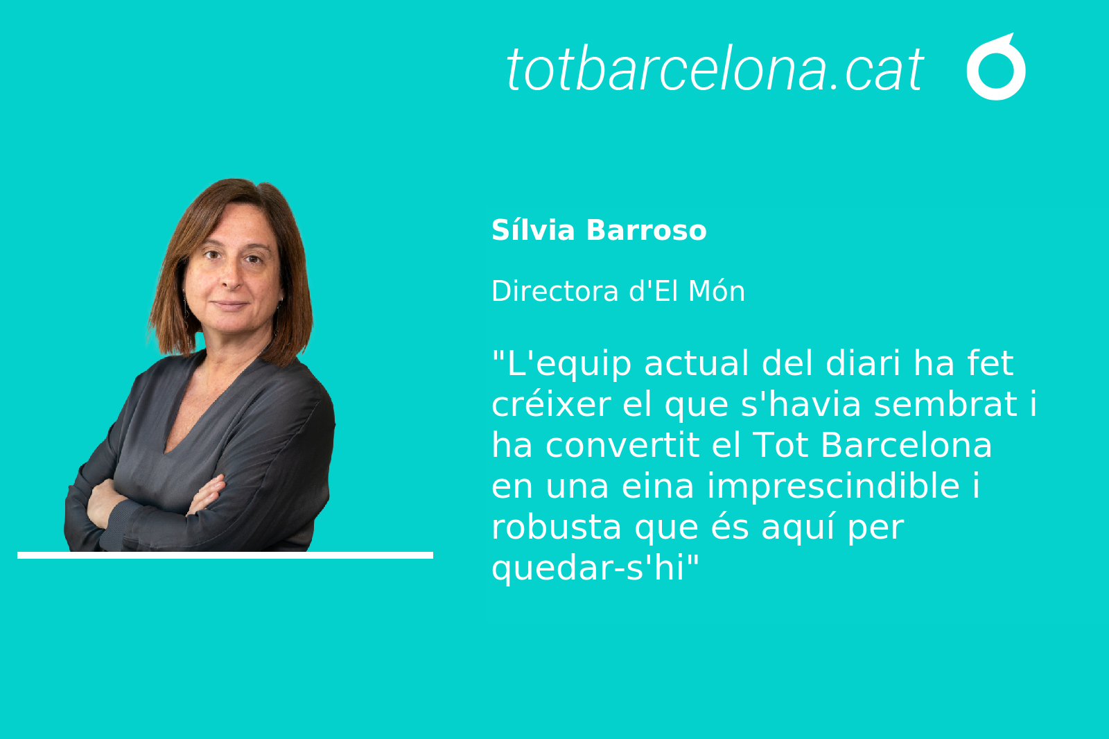 Els d’El Món, els barcelonins, els econòmics –Món Economia– i els altres companys del Grup Món compartim físicament la redacció i, per tant, idees, propostes i esbarjo. Tots els intercanvis productius. Els que vam fer arrencar el Tot vam posar-hi l’entusiasme i la força que calien en aquell moment. I ara veig cada dia a les taules del costat l’equip actual, capitanejat per Gemma Aguilera –la tercera dona directora del mitjà, després de mi mateixa i de Meritxell M. Pauné. Ells han fet créixer el que s’havia sembrat i han convertit el Tot Barcelona en una eina imprescindible i robusta que és aquí per quedar-s’hi.