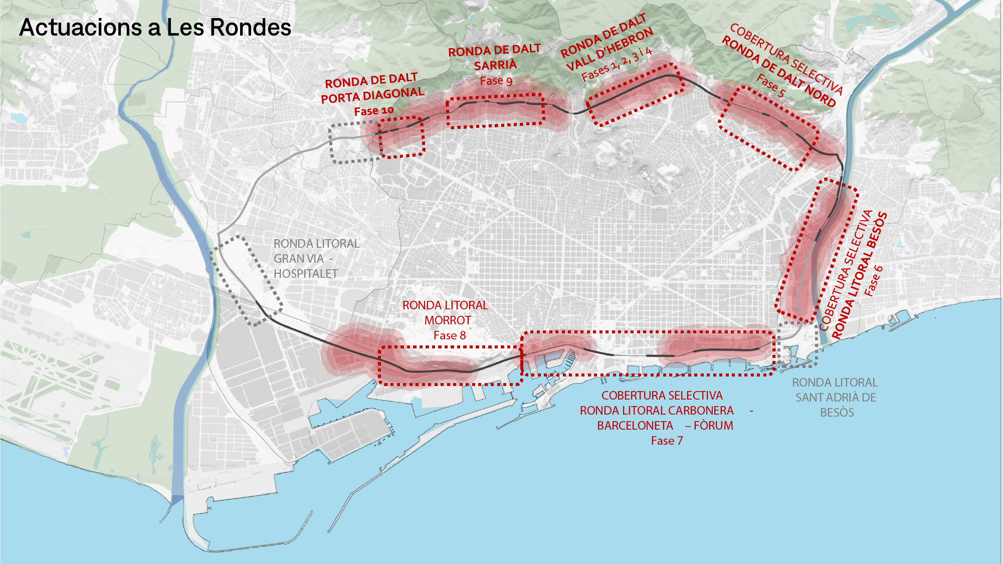 La transformació començarà a la ronda de Dalt, l’artèria que agrupa més fases del projecte. Segons la iniciativa socialista, el primer tram a cobrir ha de ser el del barri d’Horta, per després seguir a Vall d’Hebron, Nou Barris, Sarrià i Porta Diagonal. En total, 655 milions d’euros per cobrir la zona nord de la ciutat que sortiran dels pressupostos de l’Ajuntament.