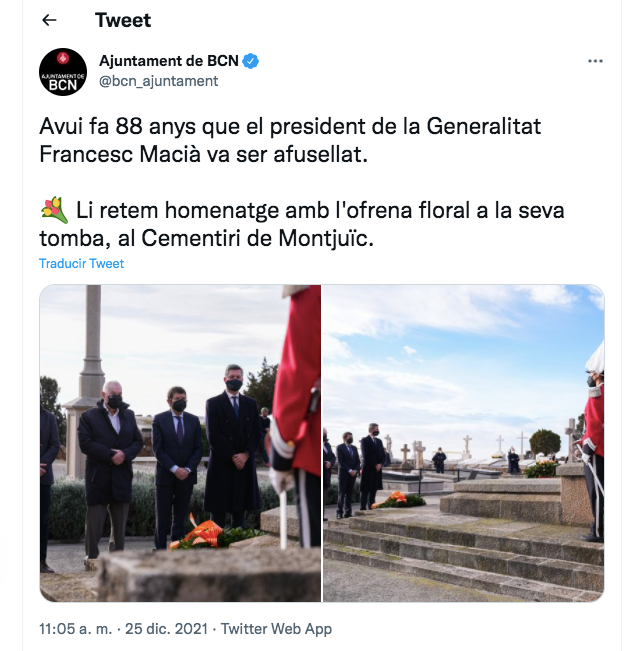 Un tuit desafortunat de l’Ajuntament de Barcelona és la broma del matí de Nadal a Twitter. Cada 25 de desembre la tomba de Francesc Macià acull una ofrena floral i el consistori de la capital catalana ha volgut commemorar-ne la mort però l’ha confós amb una altra molt diferent. En una piulada, l’Ajuntament ha atribuït a Macià (1859-1933) l’afusellament de Lluís Companys, el president català executat a Montjuïc pel règim franquista el 1940.