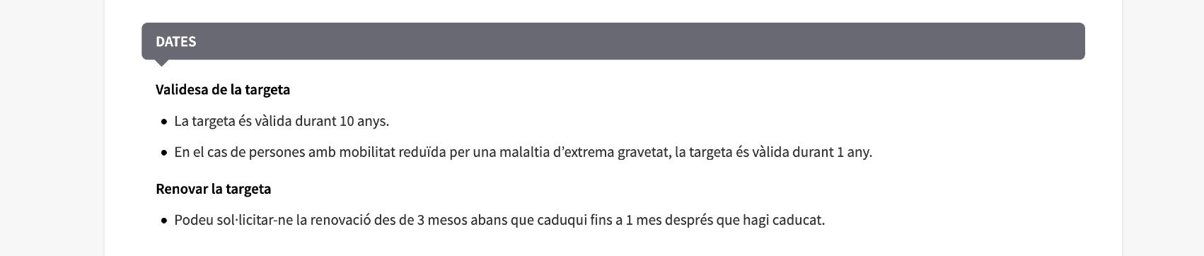 Durant aquest temps, el consistori ha continuat emetent les targetes, “de manera provisional”, amb el “règim anterior de vigència”. És a dir 10 anys i, per tant, incomplint el decret de la Generalitat. De fet, l’Ajuntament encara publicita en el web de l’oficina virtual de tràmits que la targeta és vàlida durant 10 anys, tal com es pot veure en la imatge inferior, i en el moment de publicar l’article, en l’enllaç de la pàgina de l‘Ajuntament. A parer del pèrit judicial consultat pel TOT, les targetes emeses amb una vigència de 10 anys després de l’entrada en vigor del decret de la Generalitat s’haurien d’anul·lar.
