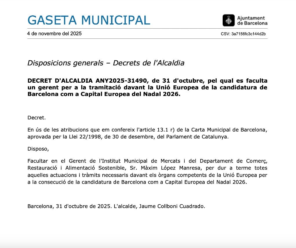 Barcelona aspira a ser la Capital Europea de Nadal del 2026. L’Ajuntament té previst presentar la candidatura davant la Unió Europea (UE). El govern de Jaume Collboni n’ha designat al gerent de l’Institut de Mercats, Màxim López, “per dur a terme totes aquelles actuacions i tràmits necessaris davant els òrgans competents de la UE per a la consecució”, recull un decret d’alcaldia publicat a la Gaseta Municipal, el butlletí oficial del consistori, aquest dimarts [veure aquí].