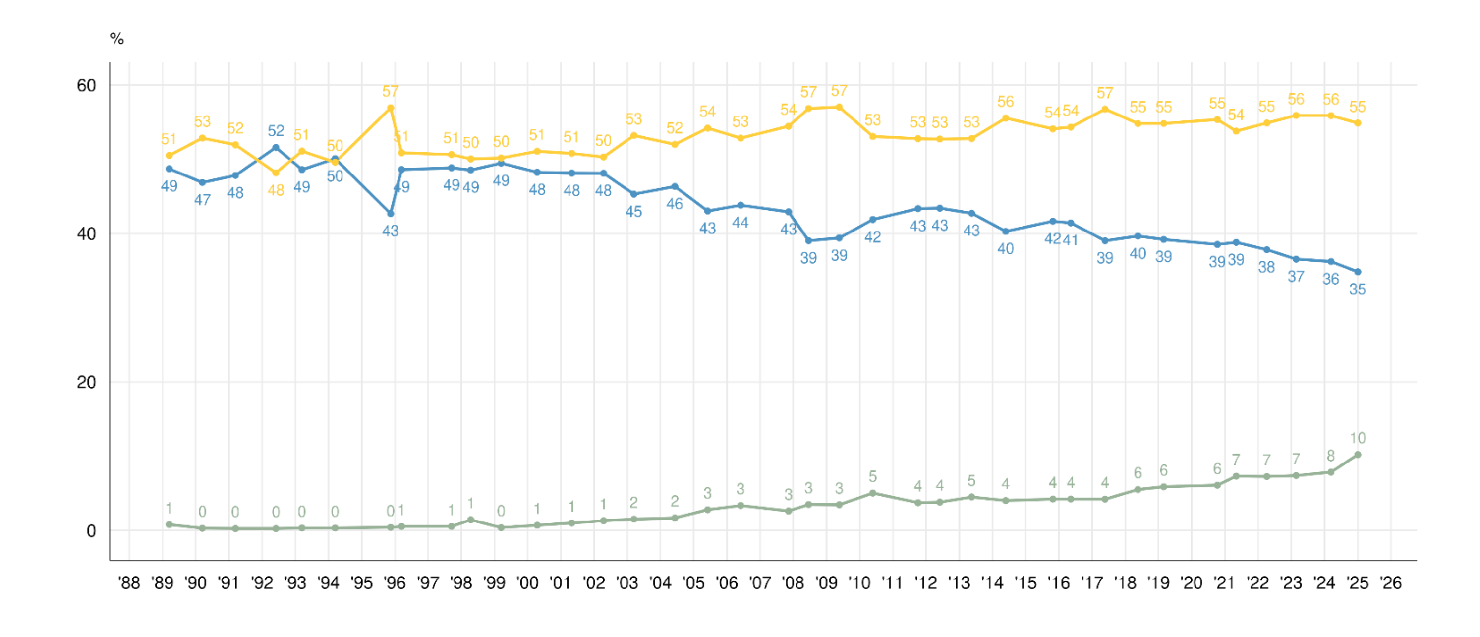 Barcelona va obrir-se al món amb els Jocs Olímpics i ho va fer majoritàriament en català. Segons els registres històrics de l’Enquesta de Serveis Municipals, el 1992 hi havia més ciutadans que parlaven habitualment en català (52%) que castellà (48%). En aquella època, la diferència entre les dues llengües era mínima, segons aquestes dades, però amb el canvi de segle l’escletxa entre els que diuen tenir el català com a llengua habitual i els que diuen tenir-ne el castellà no ha parat de créixer. Només el 35% dels ciutadans de Barcelona parlen ara català de forma habitual, vint punts menys que els que s’expressen principalment en castellà. El català arriba a mínims històrics després de deu anys de caiguda –sis punts menys des de 2015– i la distància entre les dues llengües és la més alta des que hi ha registres.