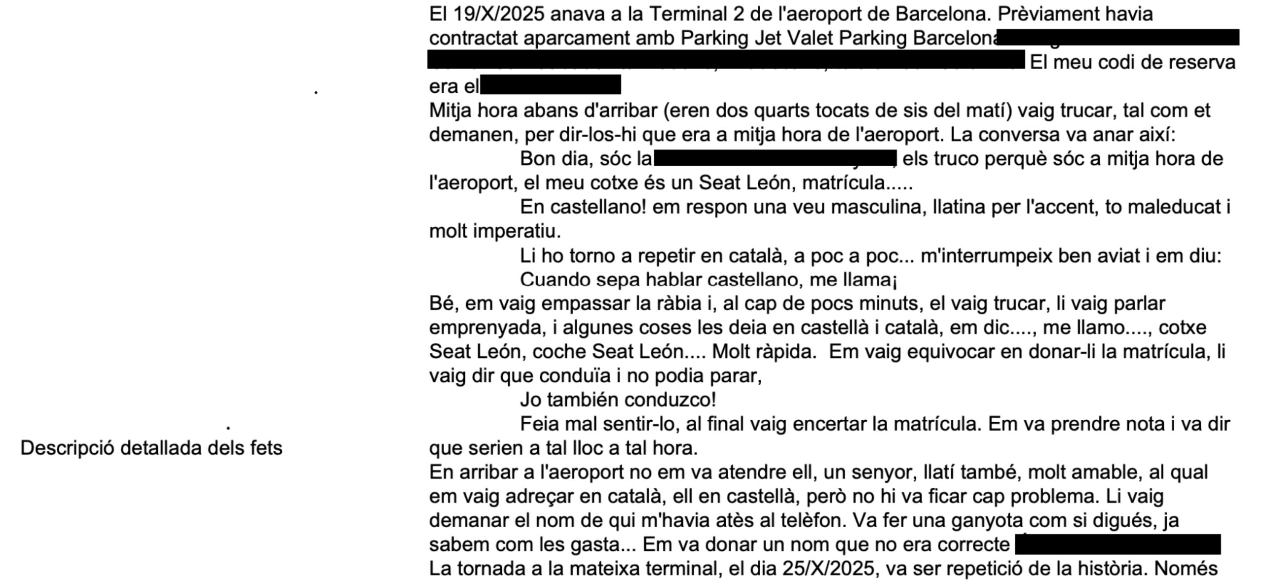 La situació l’ha portat a presentar una queixa a Plataforma per la Llengua i una altra a la Generalitat per discriminació lingüística. En aquest sentit, la Montserrat admet que li fa “molta de mandra” fer-ho, però en aquesta ocasió ho tenia “claríssim” que denunciaria els fets. En la descripció detallada dels fets de la denúncia que ha presentat a la Generalitat, a la qual ha tingut accés aquest diari, la Montserrat deixa per escrit que el treballador li va exigir parlar en castellà amb un “to maleducat i molt imperatiu” quan ella va trucar per avisar que era a 30 minuts d’arribar a l’aeroport per poder entregar el cotxe. “Li ho torno a repetir en català, a poc a poc… m’interromp ben aviat i em diu: ‘Cuando sepa hablar castellano, me llama’”, afegeix que li va dir abans de penjar-li el telèfon. Així mateix, explica que és la segona vegada que es troba en una situació com aquesta amb empreses d’aparcaments a l’aeroport de Barcelona, però remarca que “cap tan greu com aquesta”. “En algunes, em feien esperar u moment, i s’hi ficava algú que, si més no, entenia el català”, reconeix.
