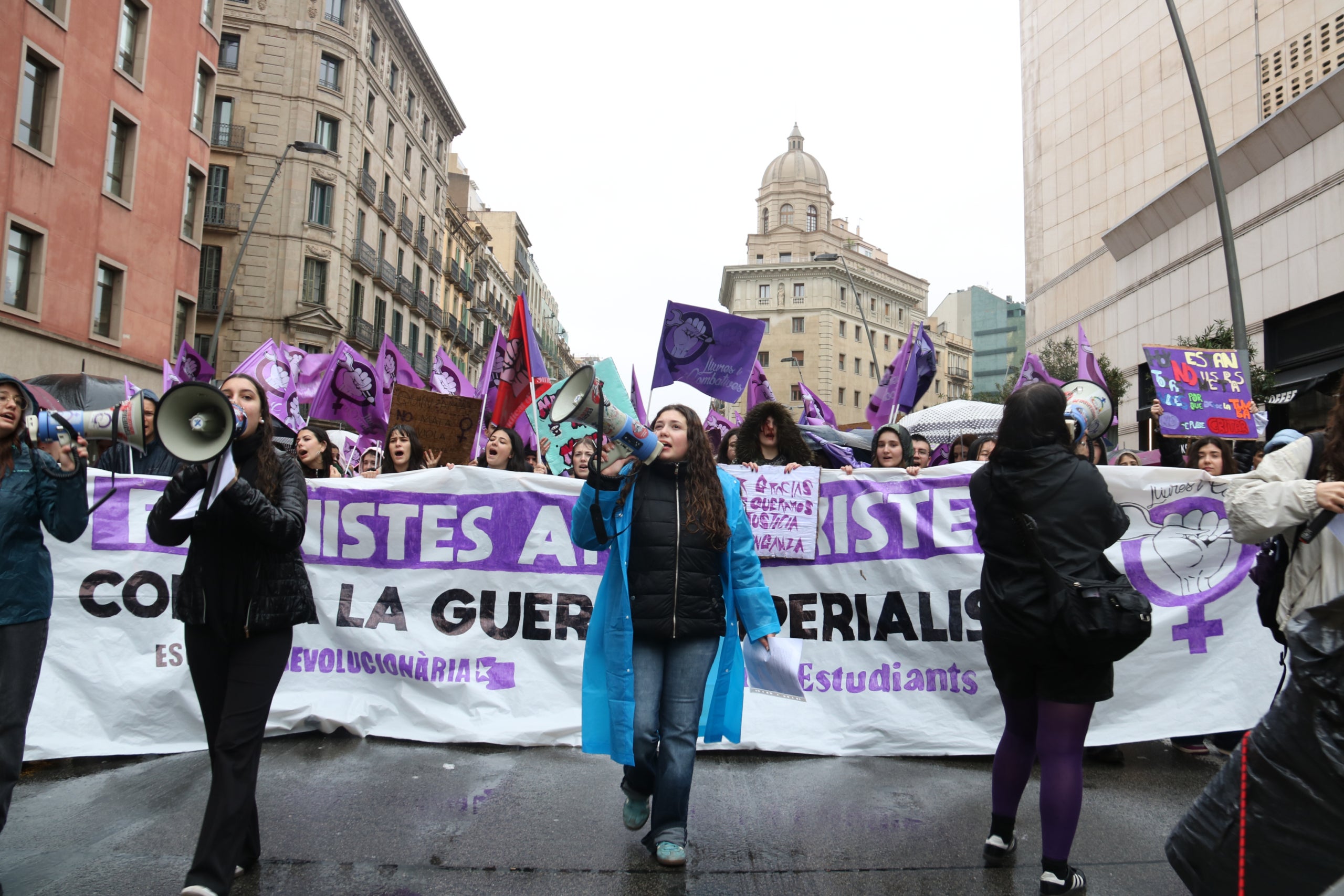 “Les feministes som antifeixistes”. Aquest ha estat el clam que més ha ressonat aquest divendres al migdia als carrers del centre de Barcelona durant la manifestació estudiantil a les portes del 8 de març. Convocades pel Sindicat d’Estudiants, la marxa ha començat a la plaça Universitat i ha acabat a Sant Jaume, i ha omplert el centre barceloní de proclames com “sense les dones no hi ha revolució”, però també de crits antifeixistes i contra la guerra que ha esclatat a l’Orient Mitjà. La portaveu del Sindicat d’Estudiants i de la plataforma Lliures i Combatives, Lua Millet, durant la protesta, ha reivindicat el paper de les dones en la transformació social i ha llançat un dard contra el PSOE, ja que l’acusen de tractar amb “impunitat” els homes agressors -en referència als escàndols que han sortit a la llum en els últims mesos.