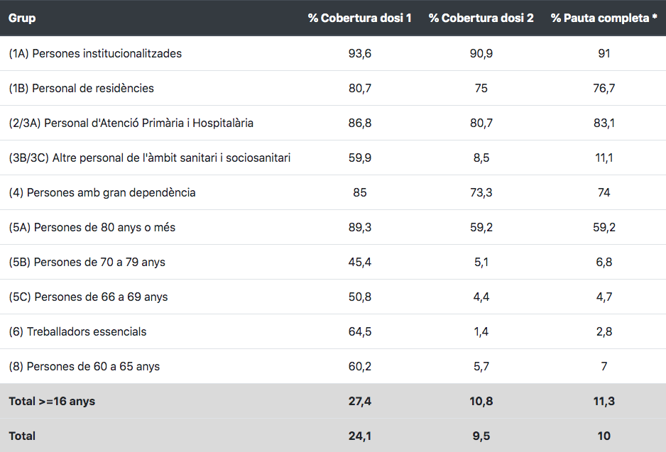 El ritme de vacunació segueix accelerant i el 10% dels barcelonins ja ha rebut la pauta completa de la vacunació contra la Covid-19, segons les dades que facilita a diari el departament de Salut. Aquesta xifra és lleugerament superior al total del país –que està en 8,8%–. Les persones que viuen en residències (91%) i el personal sanitari (83,1%) són els dos col·lectius amb un major percentatge de vacunats amb les dues dosis necessàries.