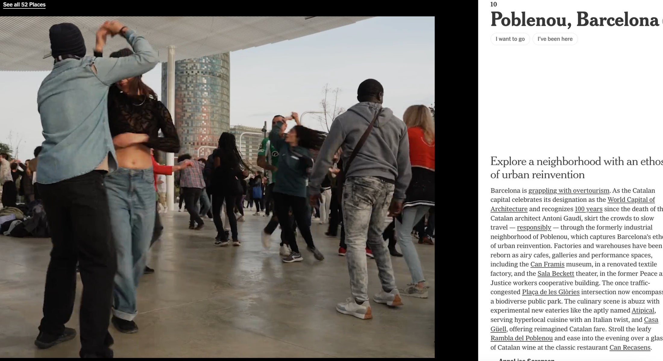 El diari nord-americà The New York Times ha fet una selecció de les cinquanta-dues millors destinacions del món per visitar aquest 2026 i ha situat un barri de Barcelona en la desena posició. Es tracta del barri del Poblenou perquè, segons el rotatiu, “l’antic barri industrial capta l’esperit barceloní de reinvenció urbana”. “Explora un barri amb un esperit de reinvenció urbana”, recomana el rotatiu, que dona l’opció als seus lectors de dir si ja hi ha estat o si tenen previst anar-hi.