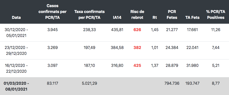 El risc de rebrot se situa ja en 626 punts, 244 més que una setmana abans, i la velocitat de contagi (Rt) s’ha enfilat fins a l’1,45. Una altra mala notícia és que la taxa de positivitat –nombre de casos respecte al total de proves– és de l’11,26%, un percentatge molt elevat que, segons els experts, indica que s’estan deixant de detectar molts casos i que compliquen el rastreig i la traçabilitat dels positius.