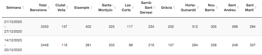 Pel que fa al nombre de contagis, l’Agència de Salut Pública de Barcelona (ASPB) té registrats 2.553 positius entre el 21 i el 27 de desembre, pràcticament els mateixos que en els set dies anteriors. La majoria de districtes, que una setmana abans havien duplicat el nombre de casos, es mantenen en dades similars. Només Gràcia, que passa de 157 a 202 casos en una setmana, ha registrat un augment considerable.