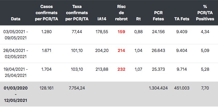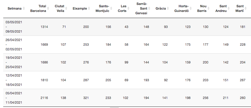 Tots els districtes registren un descens notable en el nombre de casos. L’Eixample (200) i Sant Martí (181) són els que tenen més positius, mentre que les Corts (43) és clarament el que en té menys, seguit de Ciutat Vella (71). Pel que fa als indicadors epidemiològics, el risc de rebrot ha baixat fins als 159 punts i la velocitat de contagi (Rt) se situa en 0,88, mentre que la taxa de positivitat ha baixat fins al 4,34%, un percentatge que les autoritats sanitàries consideren òptim per poder tornar a rastrejar casos i tallar les cadenes de transmissió amb més rapidesa.