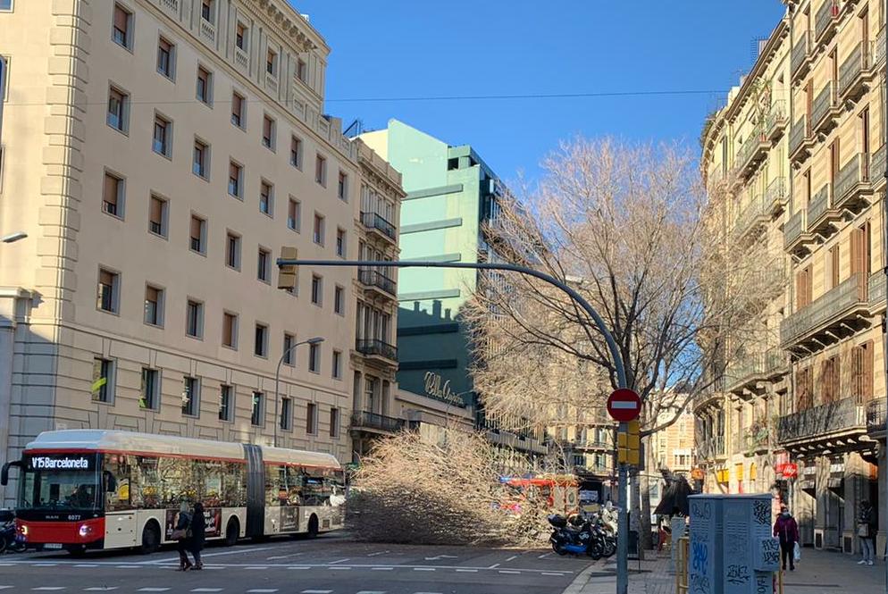 Les fortes ventades que hi ha a Barcelona han fet caure dos arbres que, afortunadament, no han causat destrosses i els incidents han quedat en dos ensurts. Un dels arbres ha caigut just davant de l’Hospital de Sant Pau i un altre al carrer Balmes amb Pelai. Fonts municipals han explicat que per ara no tenen constància que hagin caigut més arbres, però que al llarg del dia Parcs i Jardins farà un recompte dels incidents.