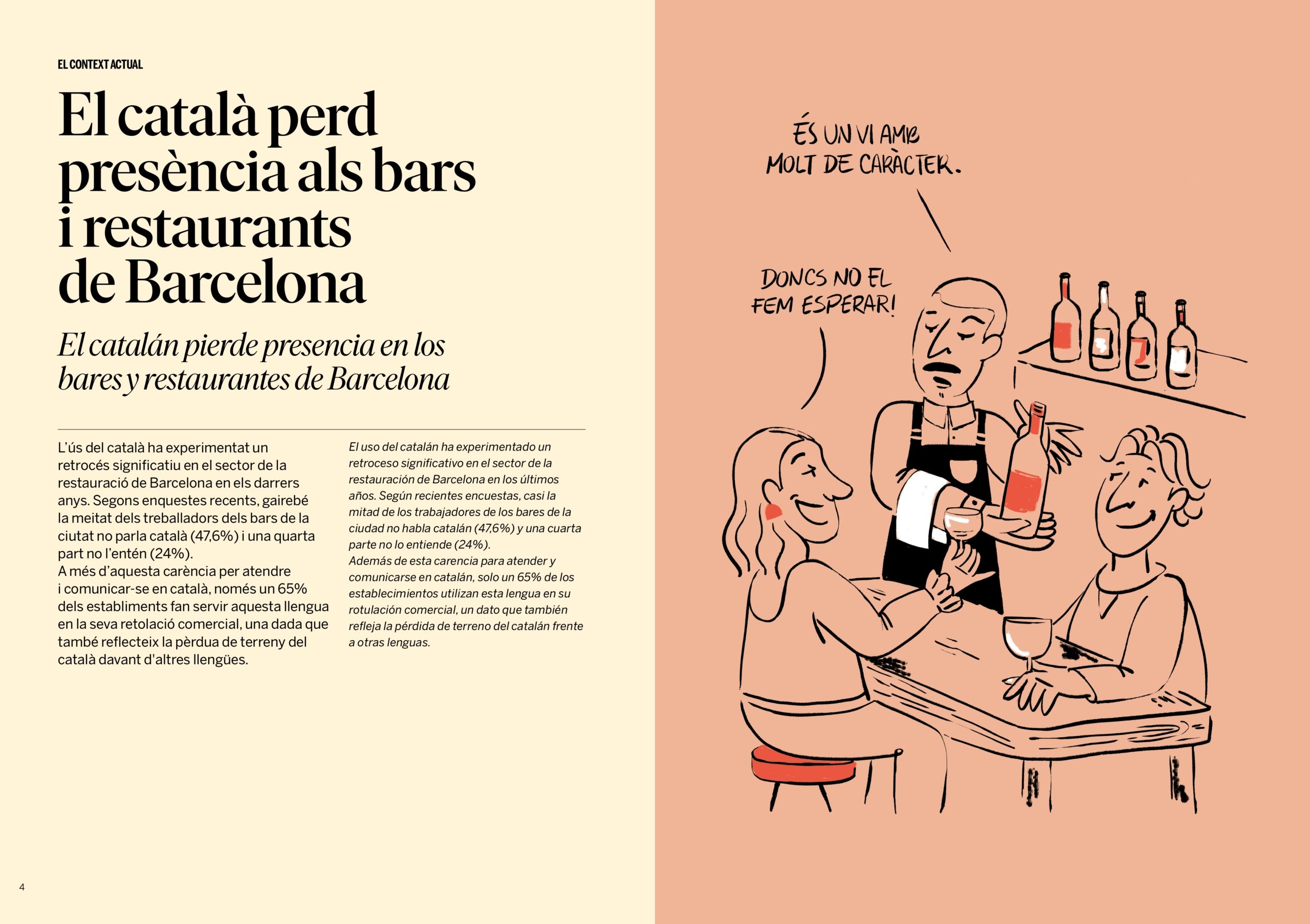 El grup municipal d’ERC a l’Ajuntament de Barcelona i el Gremi de Restauració impulsen una campanya per promoure l’ús del català en bars i restaurants de la ciutat. Tal com han explicat la presidenta republicana al consistori, Elisenda Alamany, i el director general del Gremi, Roger Pallarols, s’enviarà un fulletó, El català, ben servit, als 9.000 establiments de la capital catalana, amb l’objectiu que la clientela pugui ser atesa en català i les cartes, menús i la resta d’informació estigui en aquest idioma, com obliga la normativa. Ara mateix, un 50% del personal de bars i restaurants de la ciutat no parla el català i una quarta part ni tan sols l’entén.