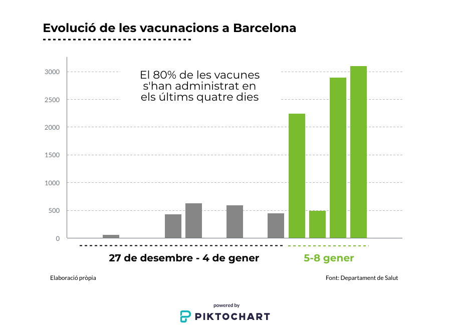 A Barcelona, per exemple, això es va traduir amb què en els tres primers només es posessin 59 vacunes. Després a poc a poc es va començar a accelerar el ritme amb una mitjana de 300 diàries fins abans de Reis. No va ser fins al dia 5, quan Salut ja havia reconegut els errors inicials de plantejament i havia començat a vacunar sanitaris, que la campanya de vacunació va agafar volada. Entre el 5 i el 8 de gener es van administrar 8.740 dosis, tot i que el dia 6, que era festiu, pràcticament no se’n van posar.