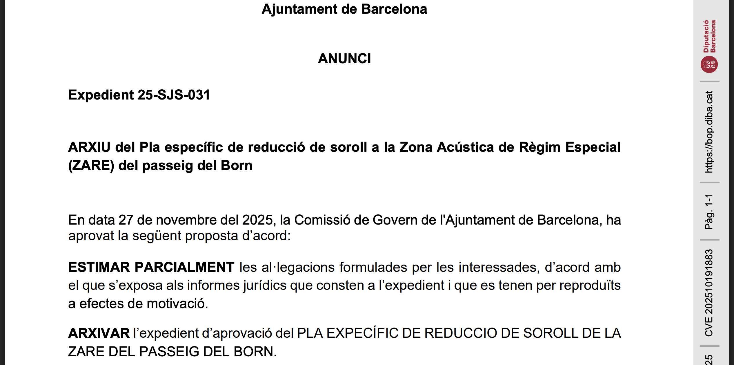 L’executiu de Jaume Collboni s’ha fet un embolic amb el pla específic de reducció de soroll del passeig del Born. El govern socialista va estimar parcialment les al·legacions formulades per diferents actors econòmics, entre ells el Gremi de Restauració, i va arxivar l’expedient el passat 27 de novembre. La mesura es va presentar a finals de gener per reduir els nivells de soroll per sota dels 65 decibels, però els restauradors al·legaven que el text tenia mancances jurídiques. El tinent d’alcalde i regidor de Ciutat Vella, Albert Batlle, ha aclarit al consell de districte de desembre que tot plegat es tracta d’un tràmit per evitar nous entrebancs judicials i que la comissió de govern ha aprovat una versió nova del text, un mes més tard després de suspendre’n el projecte original.