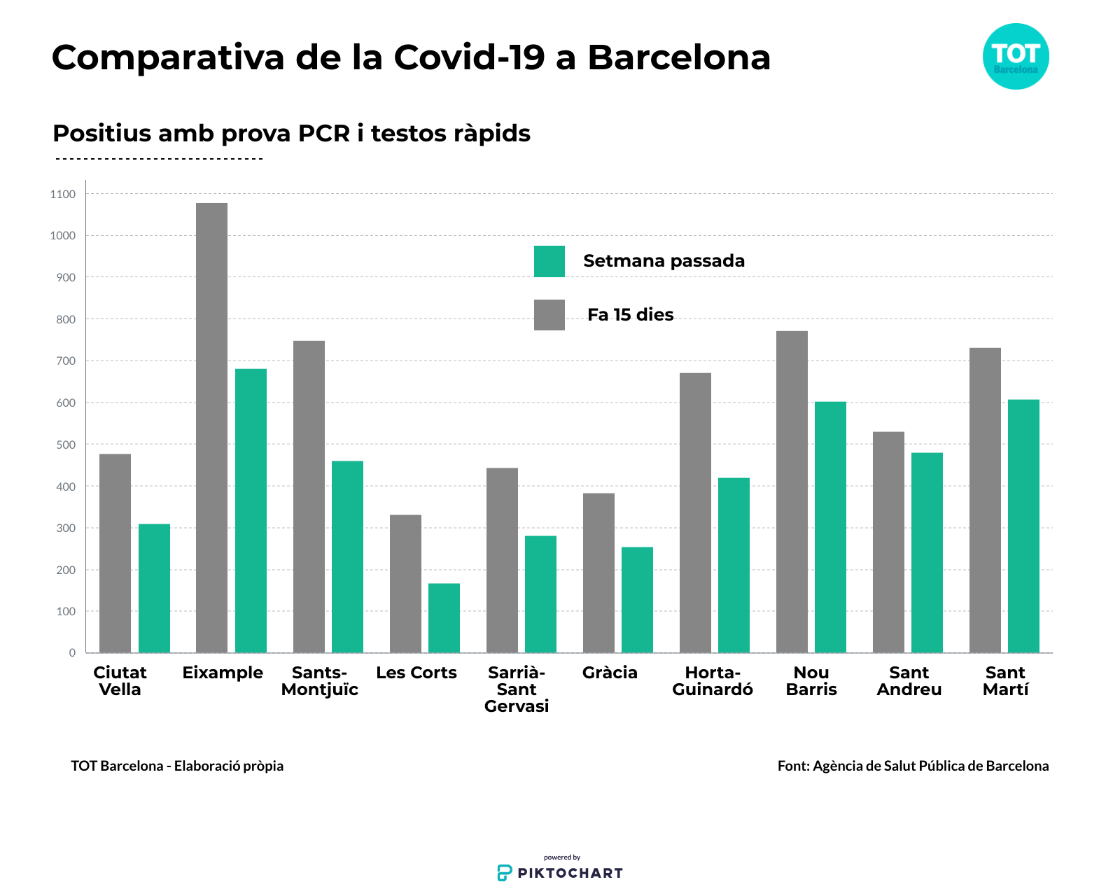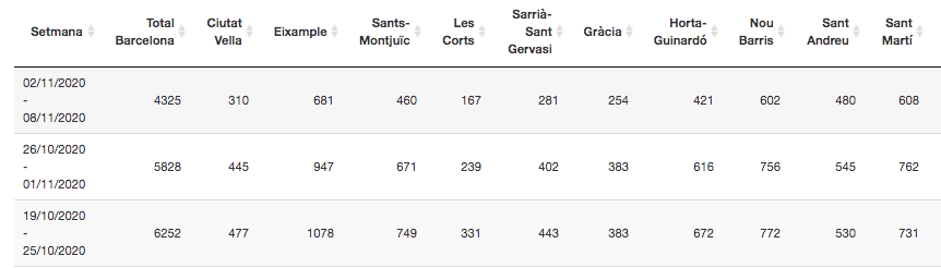 Segons les dades que publica l’ASPB, tots els districtes de Barcelona han registrat una millora substancial en el nombre de casos positius. Les Corts és el districte on s’ha produït el major descens en les dues últimes setmanes, ja que han caigut un 50%. Ciutat Vella (-35%), l’Eixample (-37%), Sants-Montjuïc (-39%), Sarrià-Sant Gervasi (-37%), Gràcia (-34%) i Horta-Guinardó (-37%) també tenen una evolució molt positiva de la pandèmia.