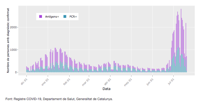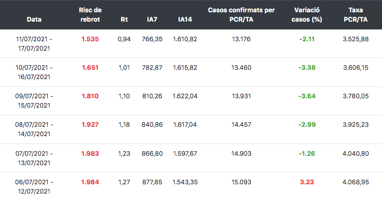Els indicadors epidemiològics també recullen aquesta frenada dels nous contagis. El risc de rebrot ha caigut més de 400 punts en una setmana –tot i que encara està disparat a 1.535– i la velocitat de contagi (Rt) ha tornat a baixar de l’1 per primera vegada des de principis de juny. El problema és que l’explosió de contagis que s’ha produït des de Sant Joan ha arribat als hospitals. Només a Barcelona hi ha gairebé 500 persones ingressades –de les quals 161 estan a l’UCI–, tot i que les dades encara són provisionals.